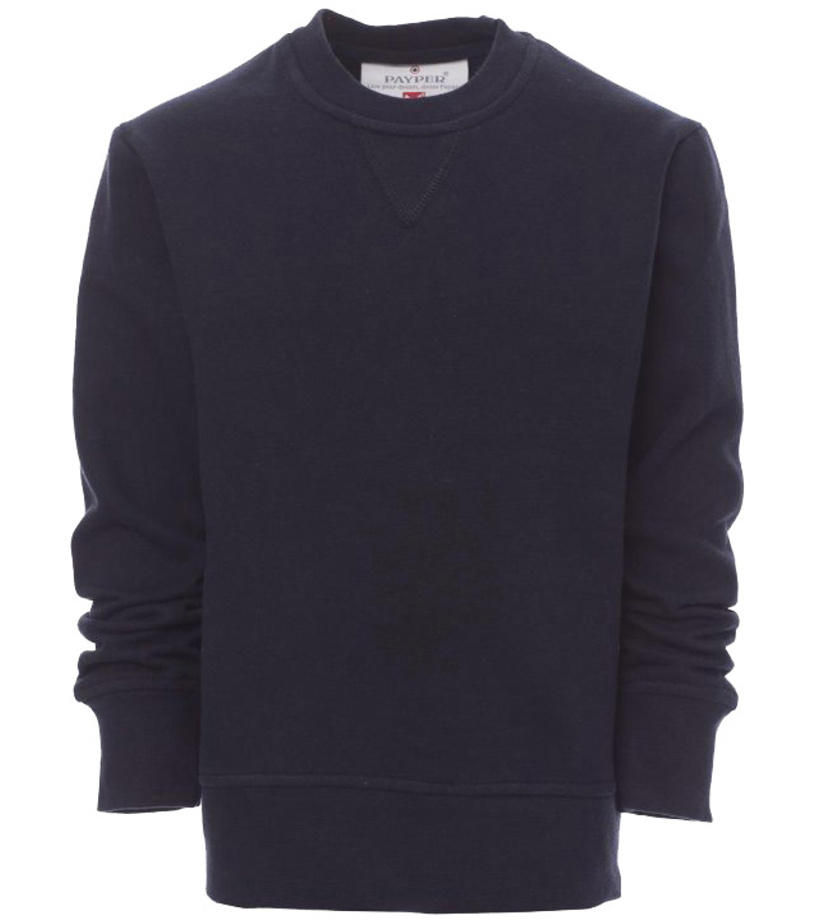 Dětská mikina s kulatým výstřihem, V-prošívání pod krkem, všívané rukávy, manžety a pas s elastickým žebrováním, zesílené švy.
