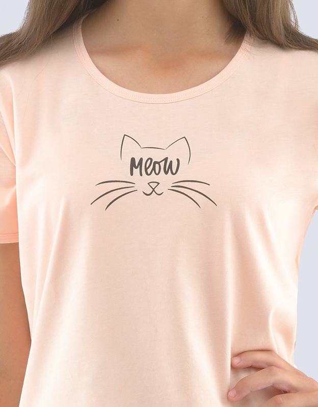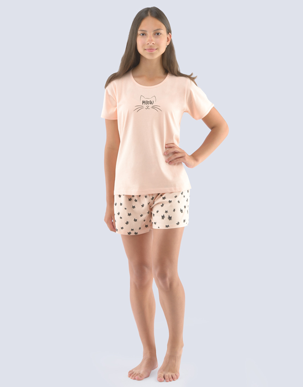 Triko s krátkým rukávem a šortky, dívčí šité pyžamo. Šortky jsou potištěné. Triko je jednobarevné s větším solitérem.