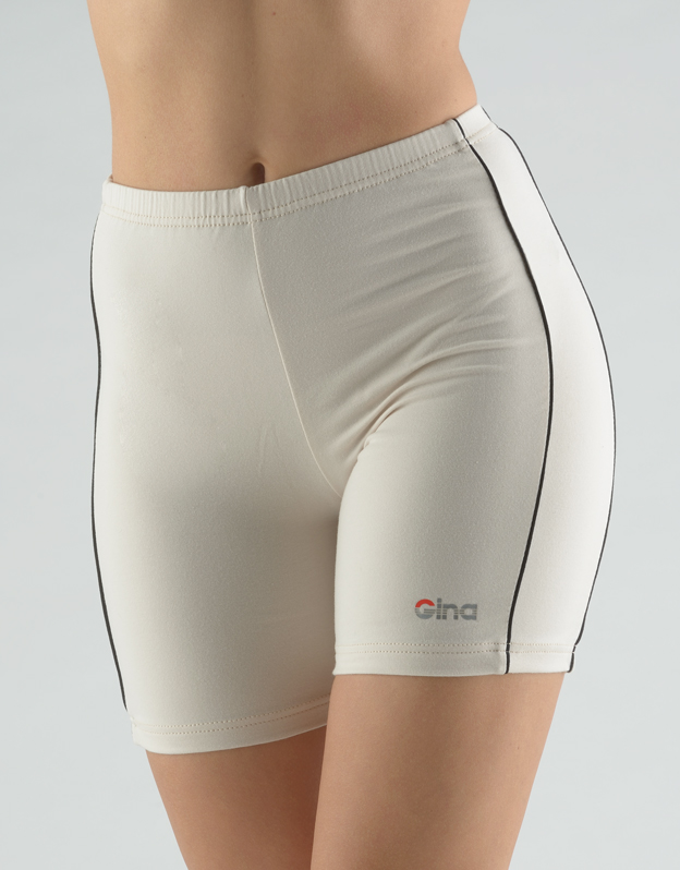 Šortky přiléhavého střihu s delší nohavičkou, dívčí šité sportovní prádlo. V pasovém kraji je zašitá úzká pruženka. Šortky jsou jednobarevné s kontrastními paspulemi všitými na bocích. Na nohavici je umístěné logo.