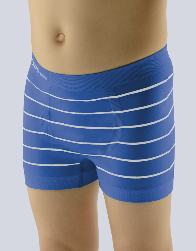 Boxerky s kratší nohavičkou, chlapecké bezešvé prádlo. Pasový kraj je zesílený a zapravený bezešvým způsobem. Nohavičky jsou zapravené bezešvým způsobem. V rozkroku je všitý klínek. Na předním díle jsou boxerky tvarovány vypletenými zónami. Boxerky mají úzké kontrastní proužky. V záložce je vypletené barevné logo.