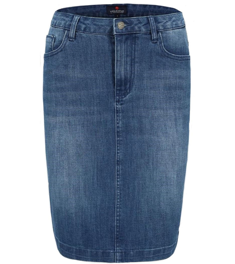 Dámská džínová sukně Volcano s délkou nad kolena. Sukně má dvě přední a dvě zadní kapsy.