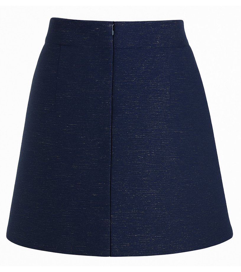 Elegantní dámská sukně v tmavě modré barvě s jemným lesklým efektem je skvělou volbou pro pracovní i společenské outfity. Má klasický pas a mírně áčkový střih, který lichotí postavě a zaručuje pohodlí při nošení. Přední díl zdobí černé lemování, které dodává modelu moderní a originální vzhled. Na zadní straně se nachází praktické zapínání na zip, které usnadňuje oblékání.