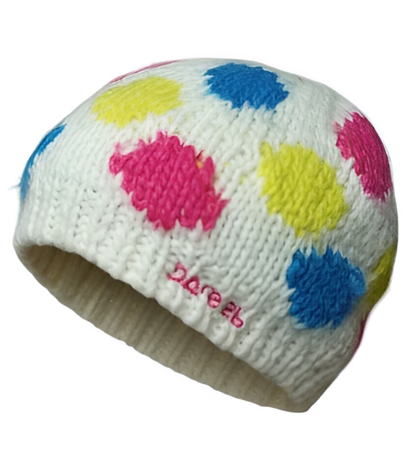 Stylová pletená čepice v bílé barvě s veselým puntíkovaným vzorem je ideální volbou pro chladné dny. Barevné puntíky v odstínech růžové, žluté a modré dodávají čepici hravý a moderní vzhled, který zaujme na první pohled.