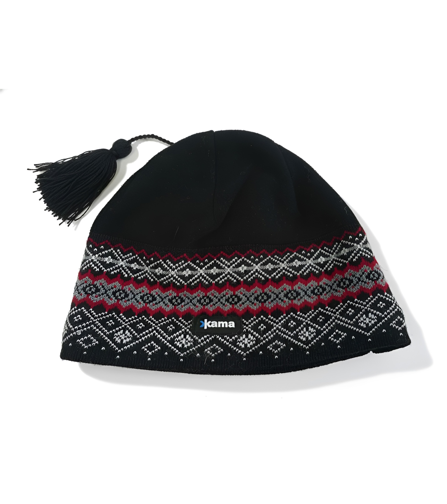 Design zdobí klasický norský vzor v kombinaci černé, šedé a červené barvy, doplněný o stylový střapec na vrcholu. Na přední straně je decentní logo Kama.