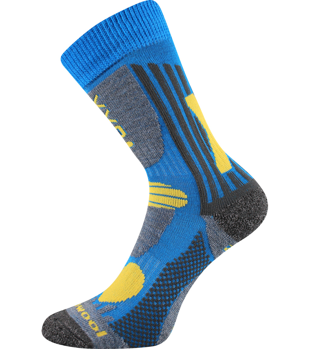 Dětské froté ponožky, polstrované zóny proti otlakům a puchýřům, jemný svěr lemu, vysoká prodyšnost, antibakteriální ochrana ionty stříbra v materiálu silproX, maximální tepelný comfort díky merino vlně CLIMAYARN. Testováno na Antarktidě.