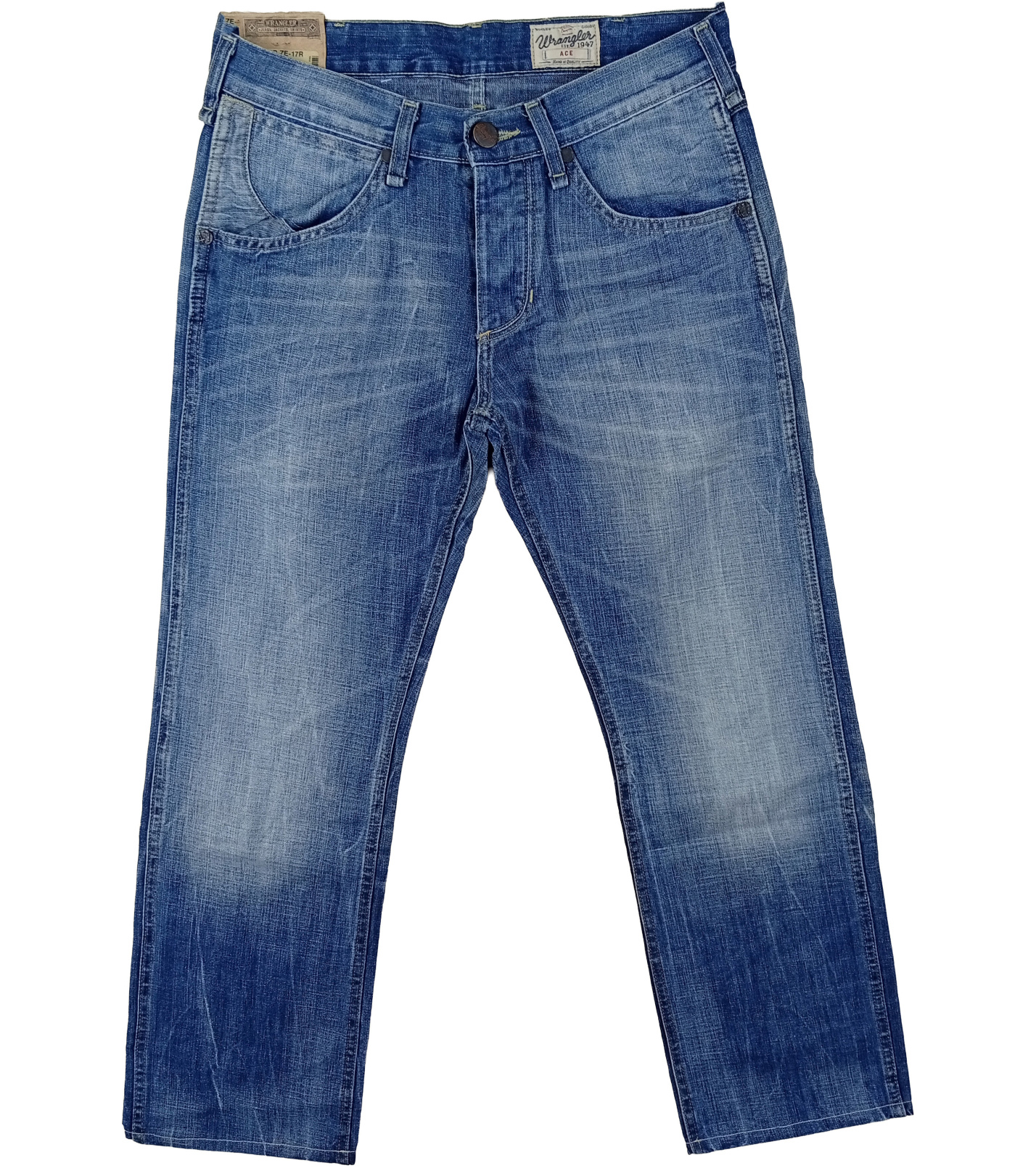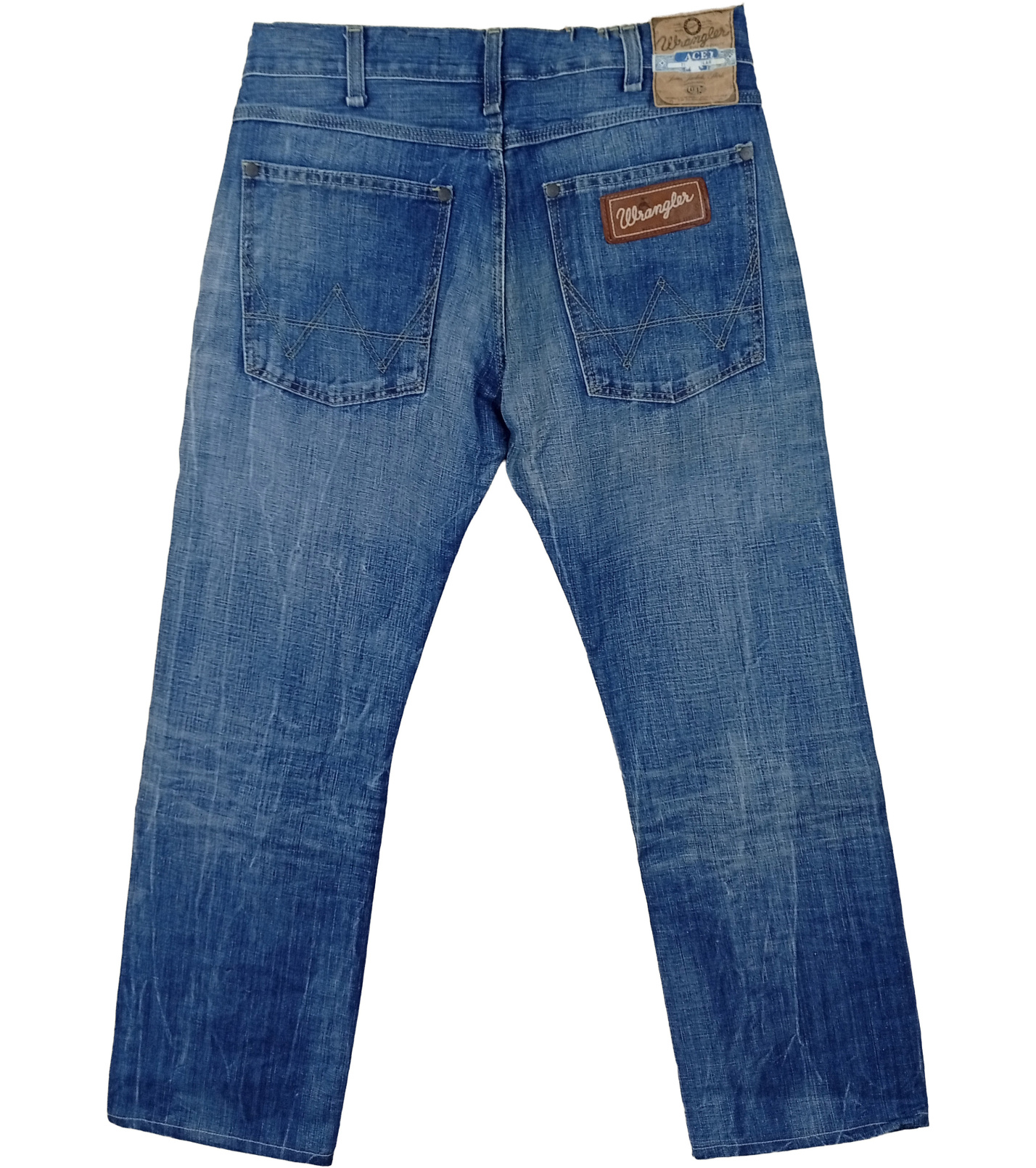 Pánské džíny Wrangler W14R-ZE ve světle modrém denimu s výrazným vyšisováním nabízejí moderní rovný střih (regular fit) se středně vysokým pasem. Mají klasické zapínání na zip s knoflíkem, pět kapes a zadní kapsy zdobené ikonickým „W“ prošíváním a koženým štítkem Wrangler.