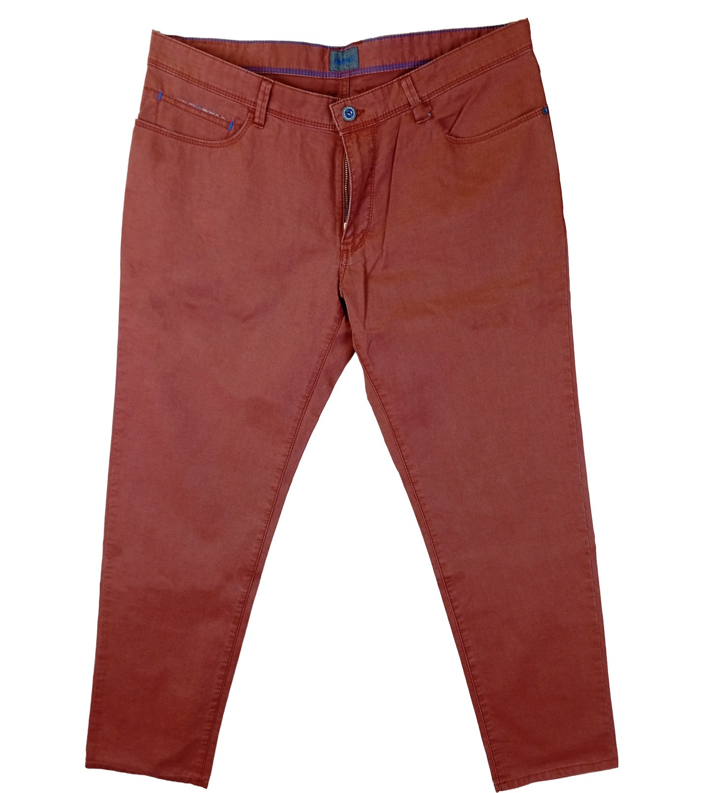 Originální pánské chinos kalhoty značky Hattric v cihlově červeném odstínu. Kalhoty mají klasické kapsy, zapínání na zip a knoflík a pas s poutky na opasek. Moderní střih s mírně zúženou nohavicí dodává kalhotám elegantní vzhled a univerzální využití – hodí se k volnočasovým outfitům i k ležérnějšímu byznys stylu.