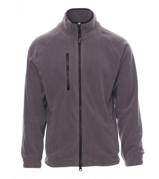 Pánská flísová bunda s 8mm černým plastovým celozipem, raglánové rukávy, stahovací šňůrka v pase, elastické stahovací manžety na zápěstí, dvě kapsy se skrytým zipem, jedna přední kapsa na zip, kontrastní výztuž límečku, zesílené švy.