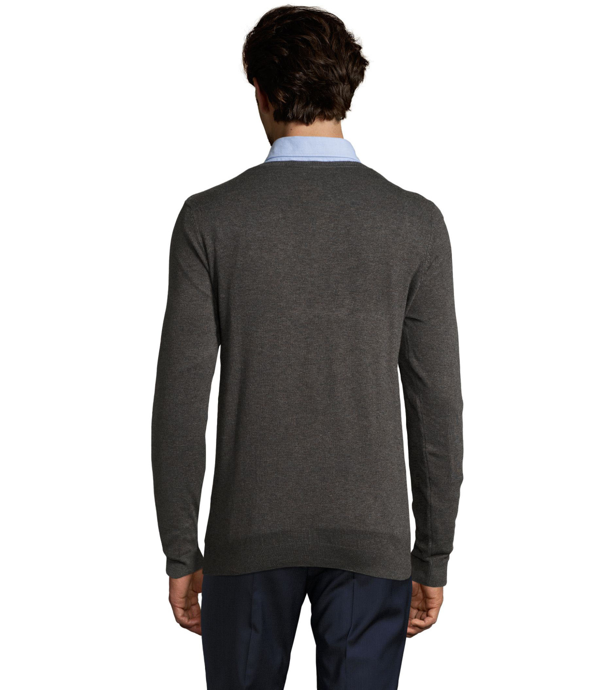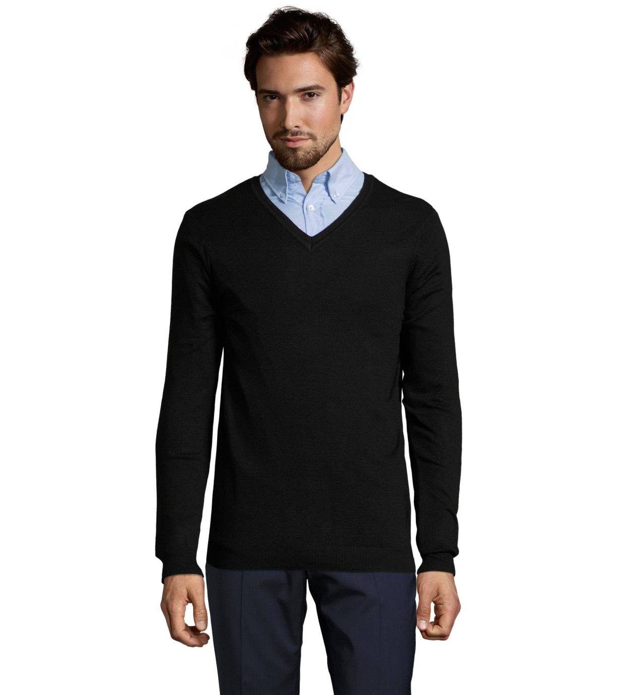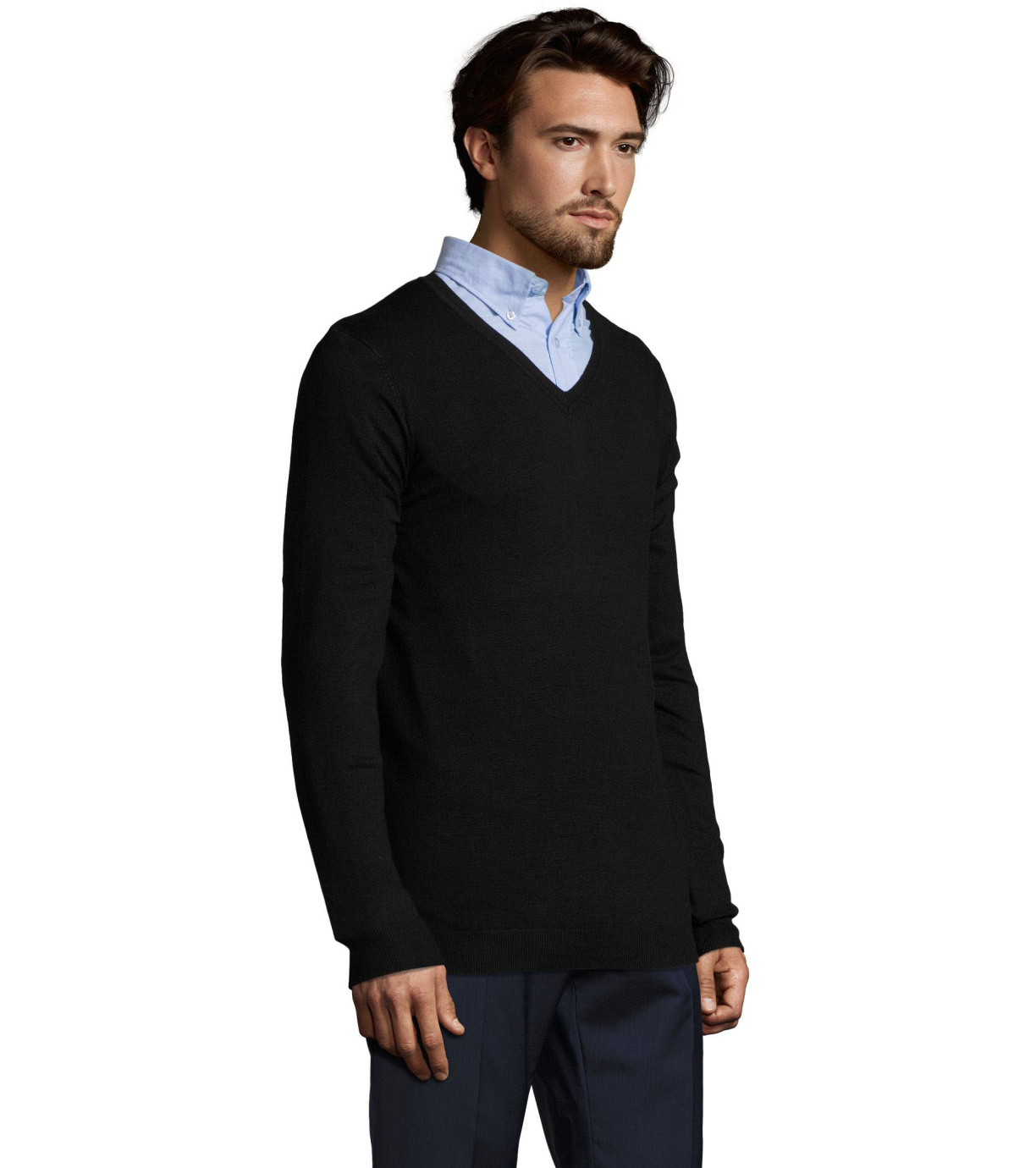 Pánský moderní svetr s výstřihem do V, je ideální na běžné nošení i na společenské události. Má vypasovaný střih. Rukávy, spodní okraj a výstřih jsou zakončeny elastickým žebrovaným lemem 1x1.