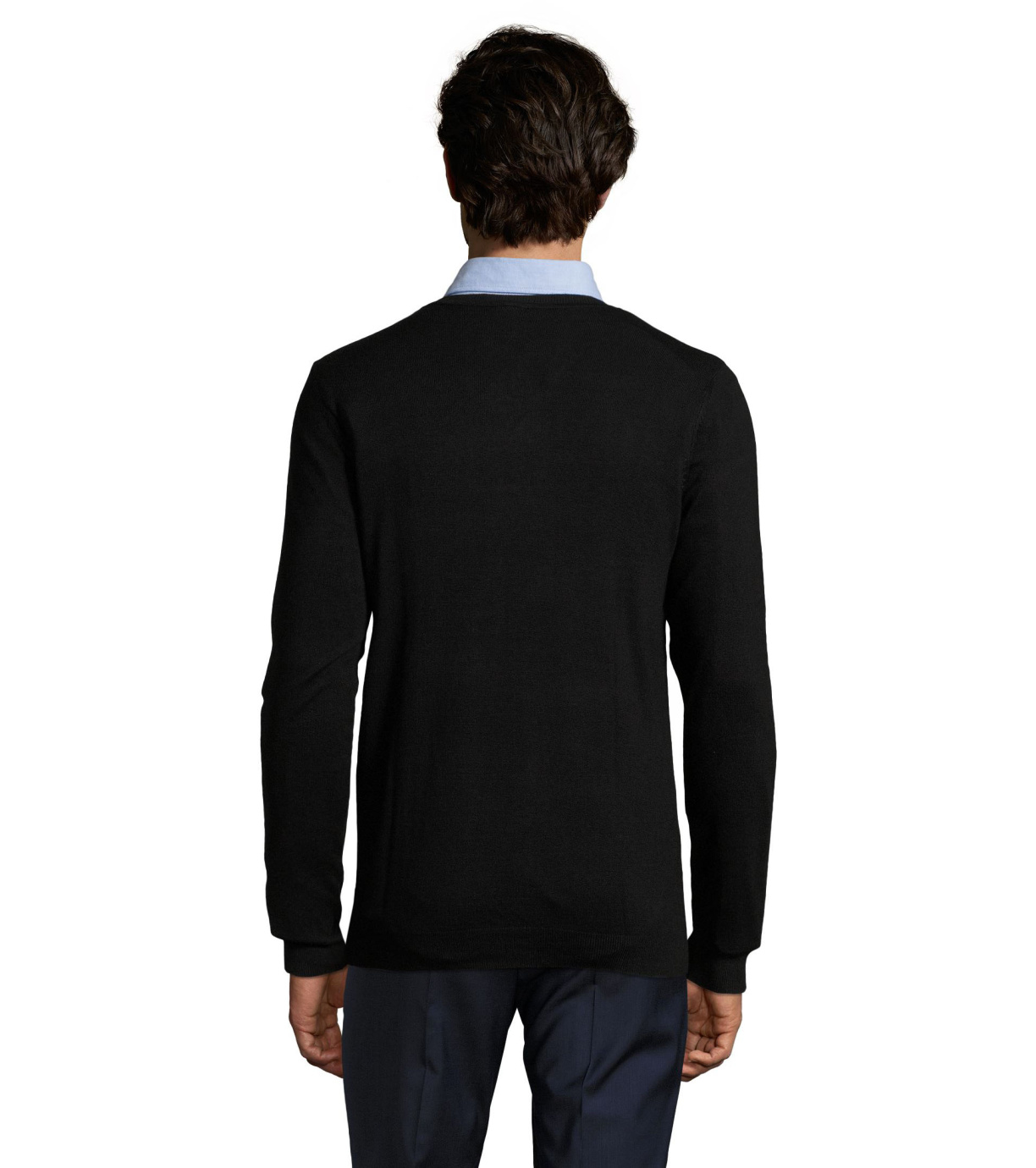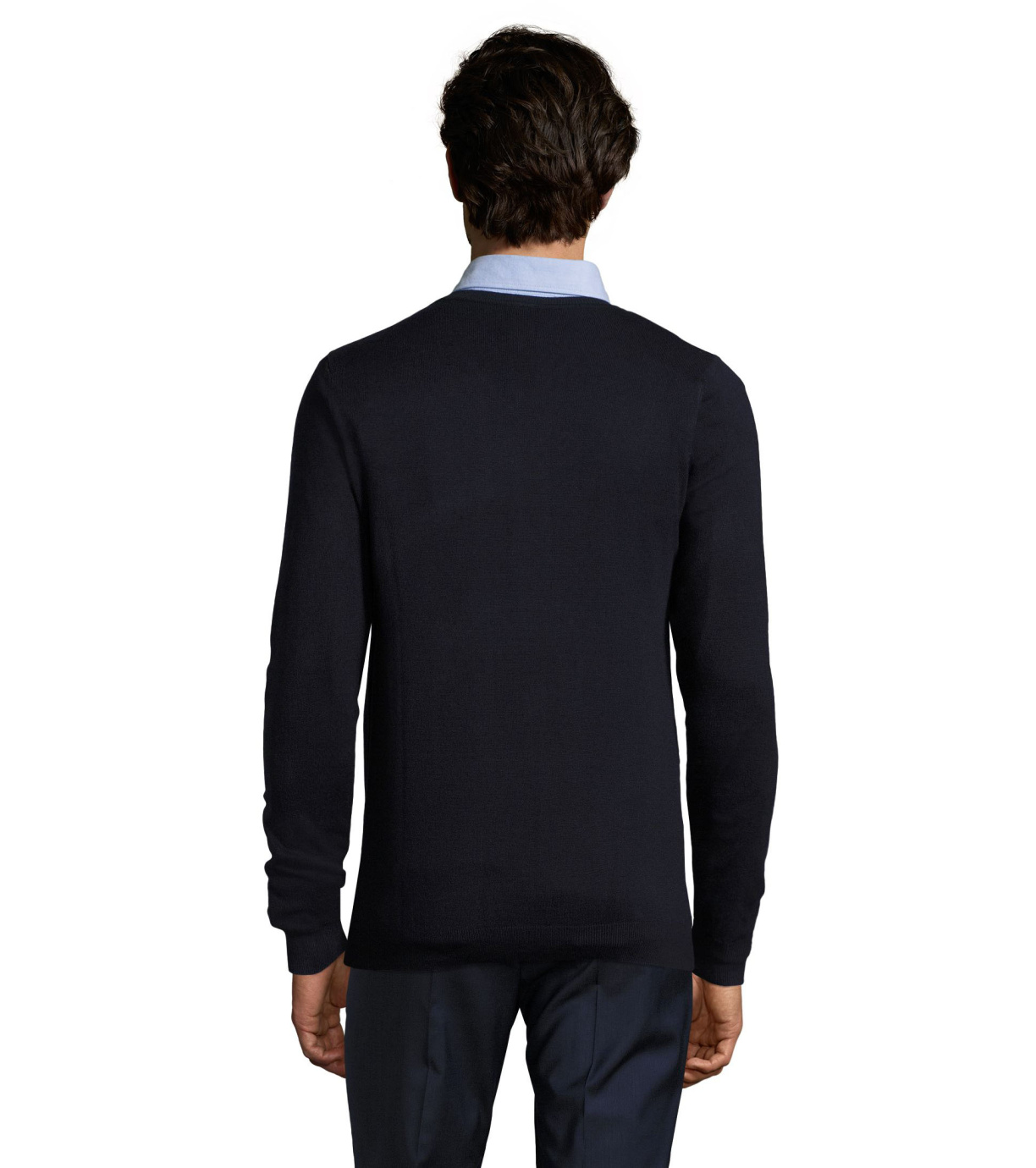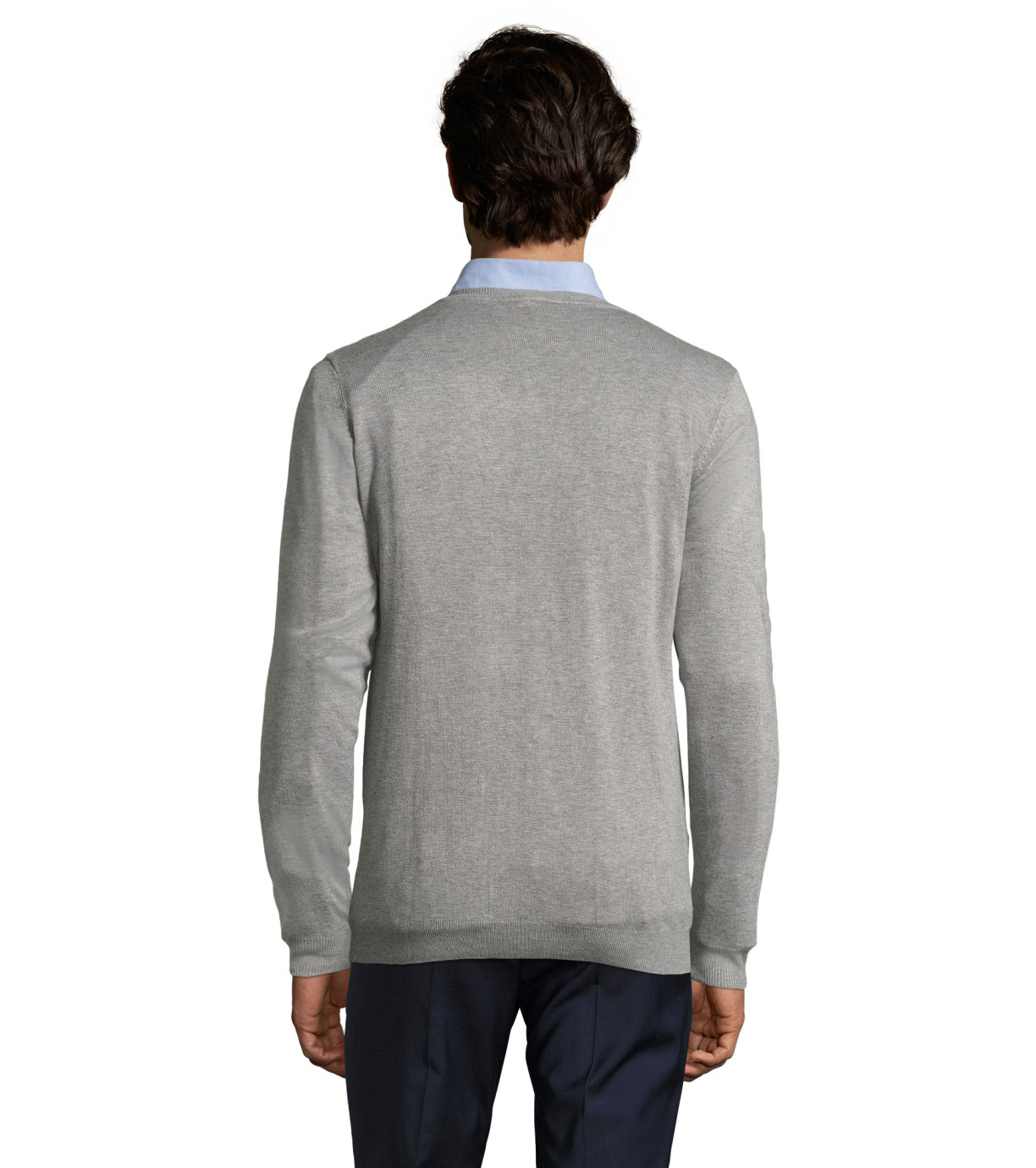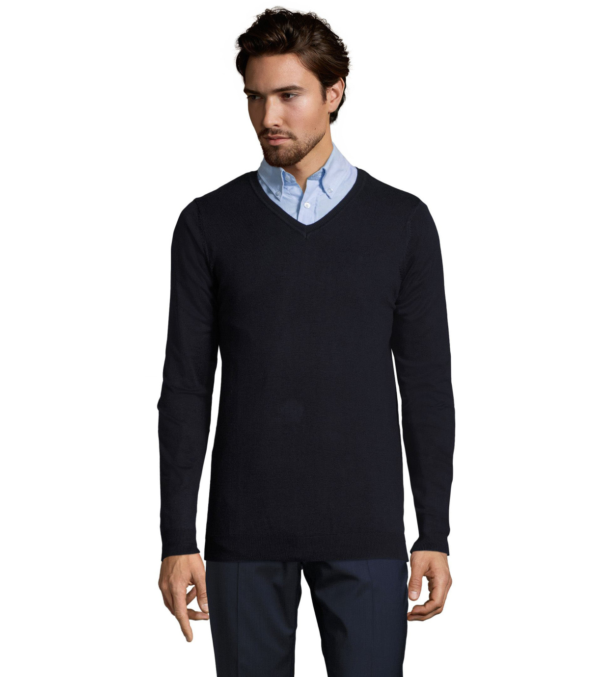 Pánský moderní svetr s výstřihem do V, je ideální na běžné nošení i na společenské události. Má vypasovaný střih. Rukávy, spodní okraj a výstřih jsou zakončeny elastickým žebrovaným lemem 1x1.