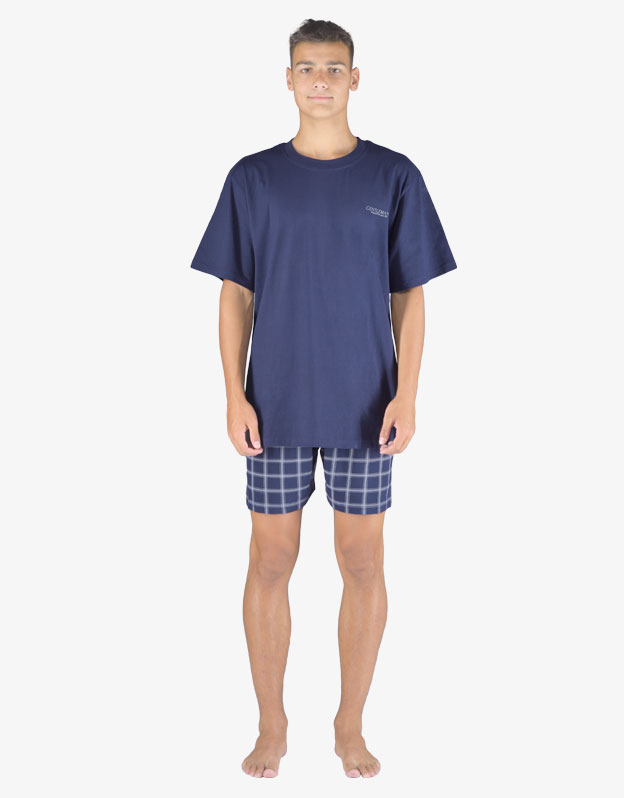 Pánské pyžamo volného střihu z jemného úpletu Vám poskytne pohodlí během spánku. Oblíbeným vzorem káro jsou potištěny krátké kalhoty, triko s krátkými rukávy zdobí malý potisk na hrudi. Oblíbeno džentlmeny.