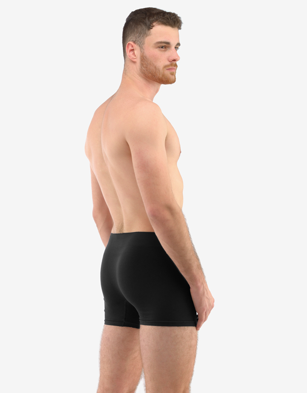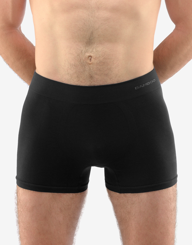 Boxerky s delší nohavičkou, pánské bezešvé prádlo. Pasový kraj je zesílený a zapravený bezešvým způsobem. Nohavičky jsou zapravené bezešvým způsobem. V rozkroku je všitý klínek. Na předním díle jsou boxerky tvarovány vypletenými zónami. Boxerky jsou jednobarevné. V záložce je vypletené logo v šedé barvě.