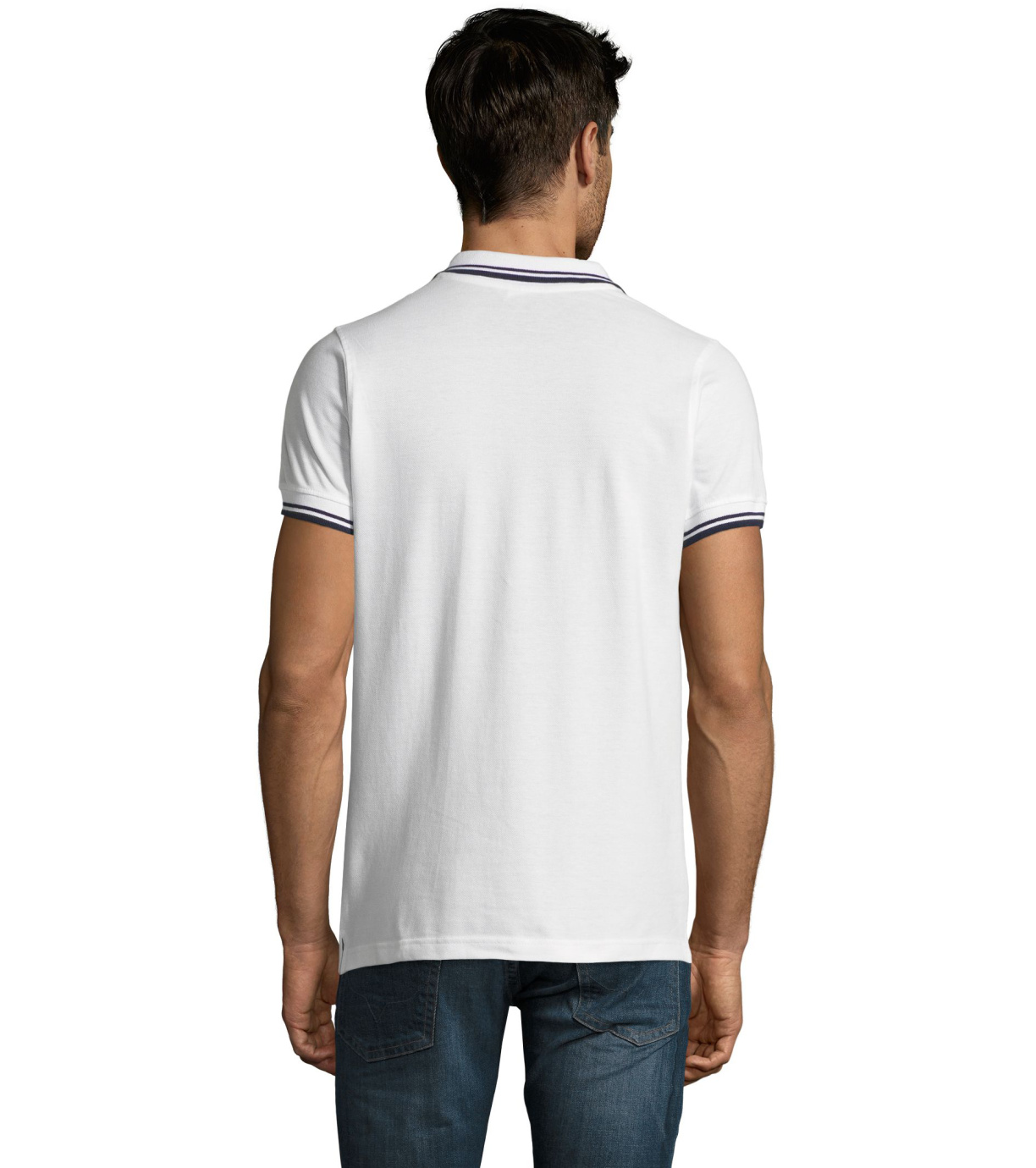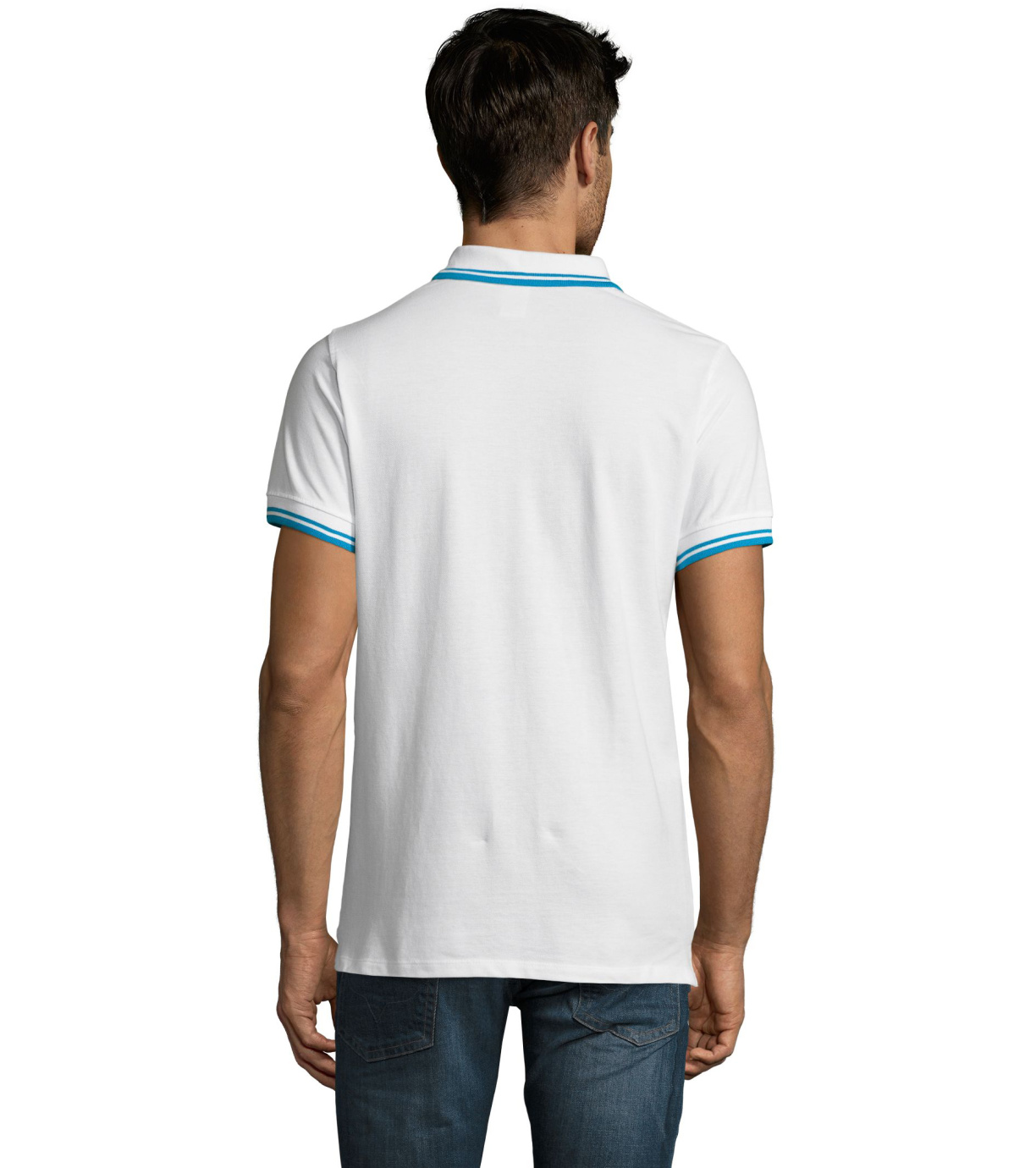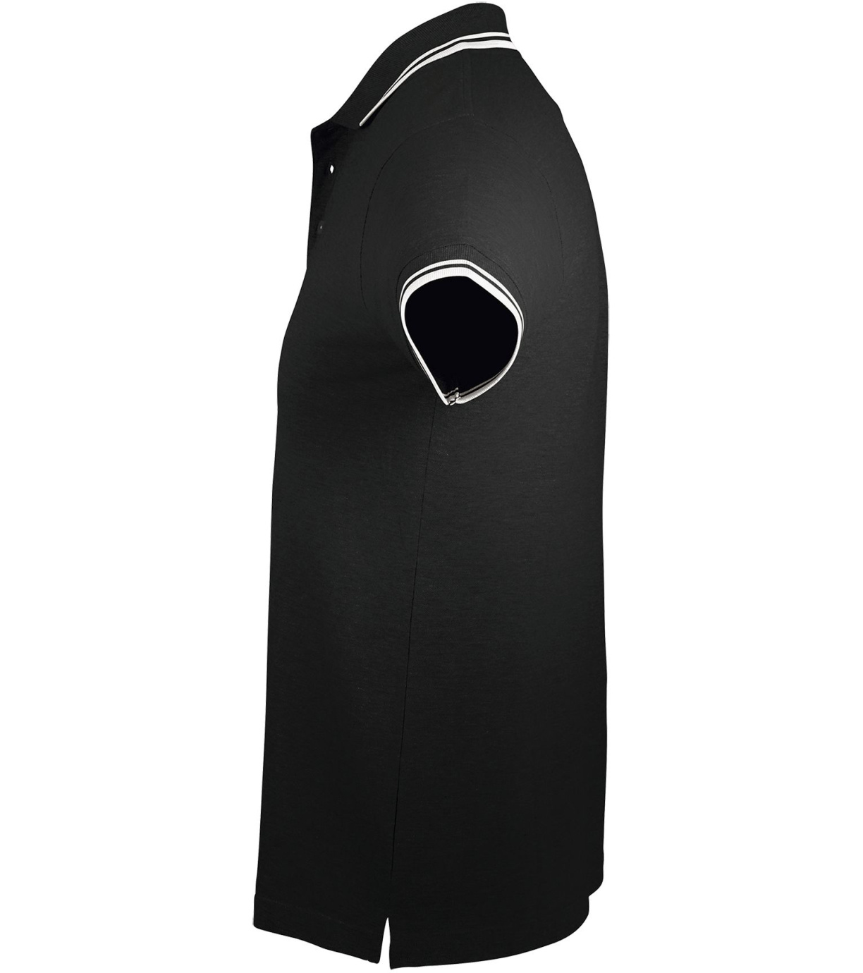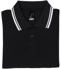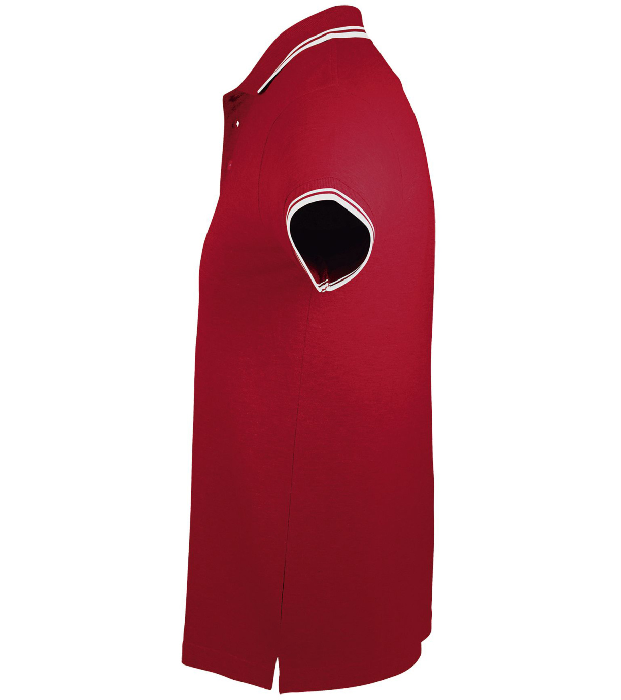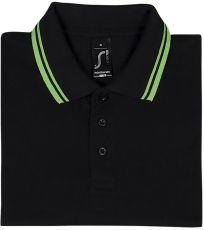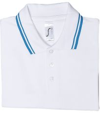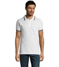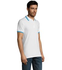 Krátké rukávy. Kontrastní pruhy na límci a manžetách. Zapínání na 3 knoflíky. Zesilující páska na krku. Žebrované zakončení límce i rukávů 1x1. Vypasovaný střih. Menší rozparek na bocích ve spodní části. Náhradní knoflík na vnitřním švu.