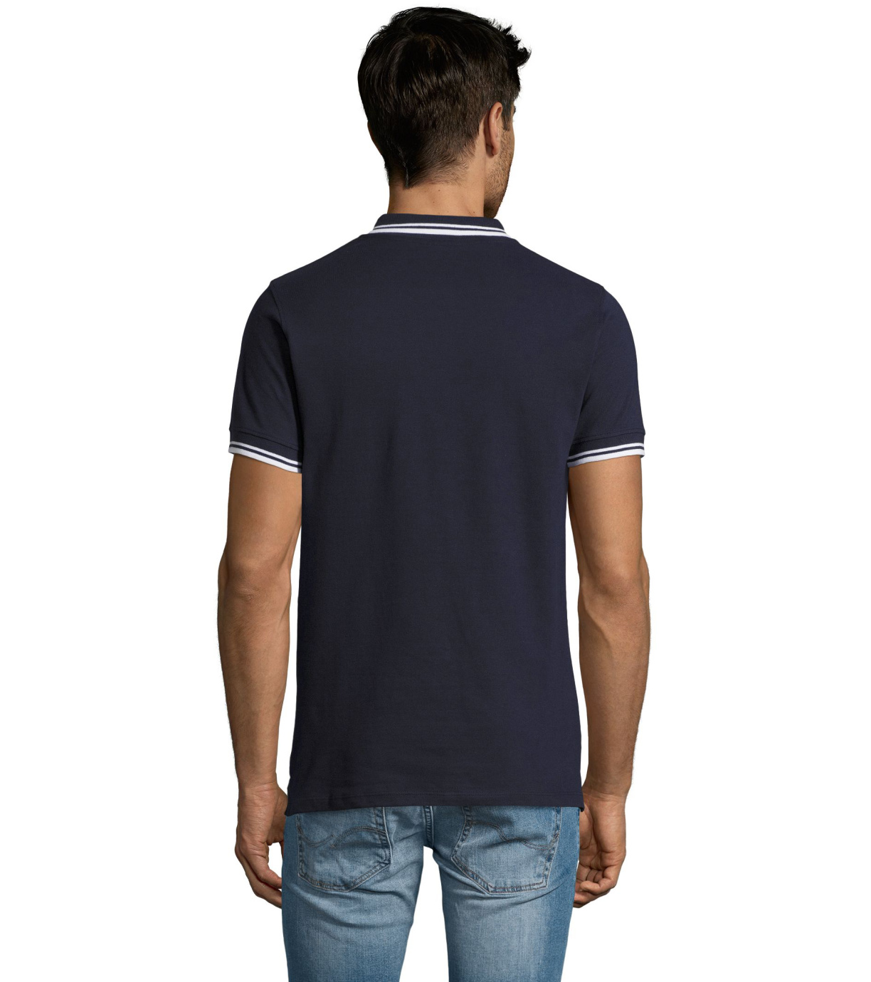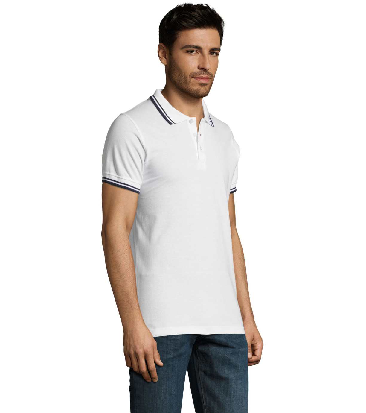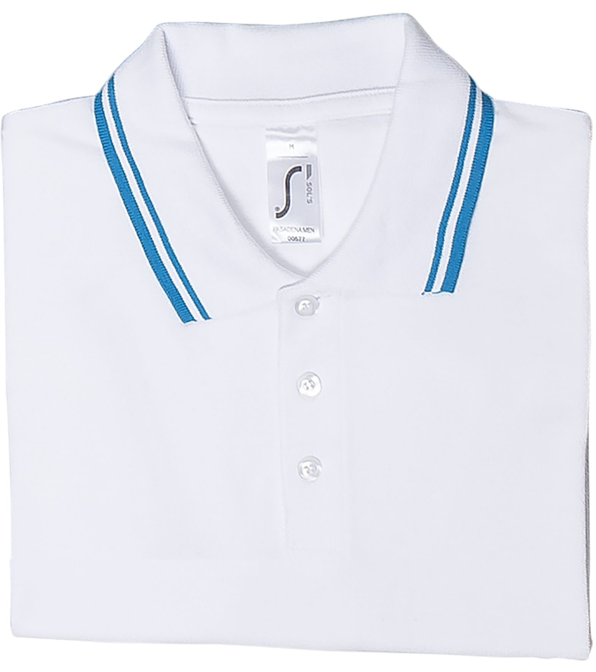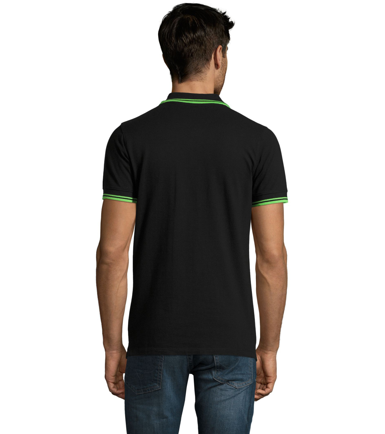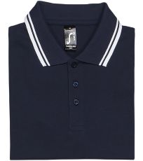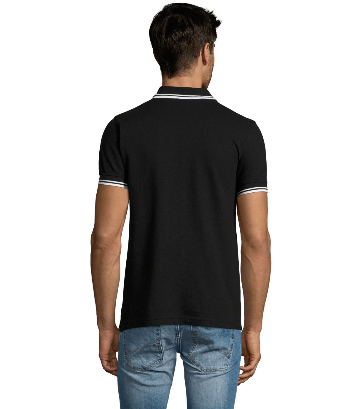 Krátké rukávy. Kontrastní pruhy na límci a manžetách. Zapínání na 3 knoflíky. Zesilující páska na krku. Žebrované zakončení límce i rukávů 1x1. Vypasovaný střih. Menší rozparek na bocích ve spodní části. Náhradní knoflík na vnitřním švu.