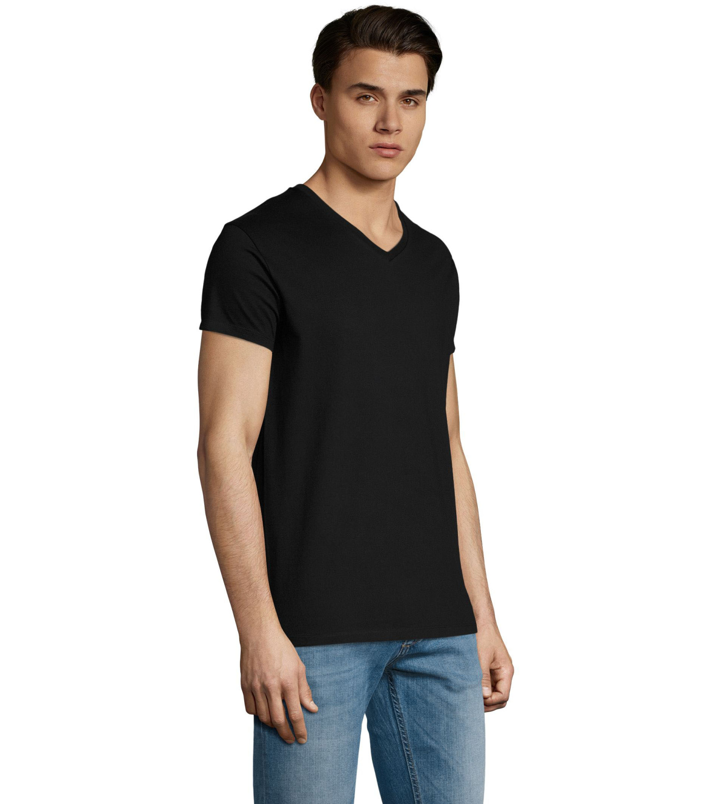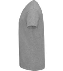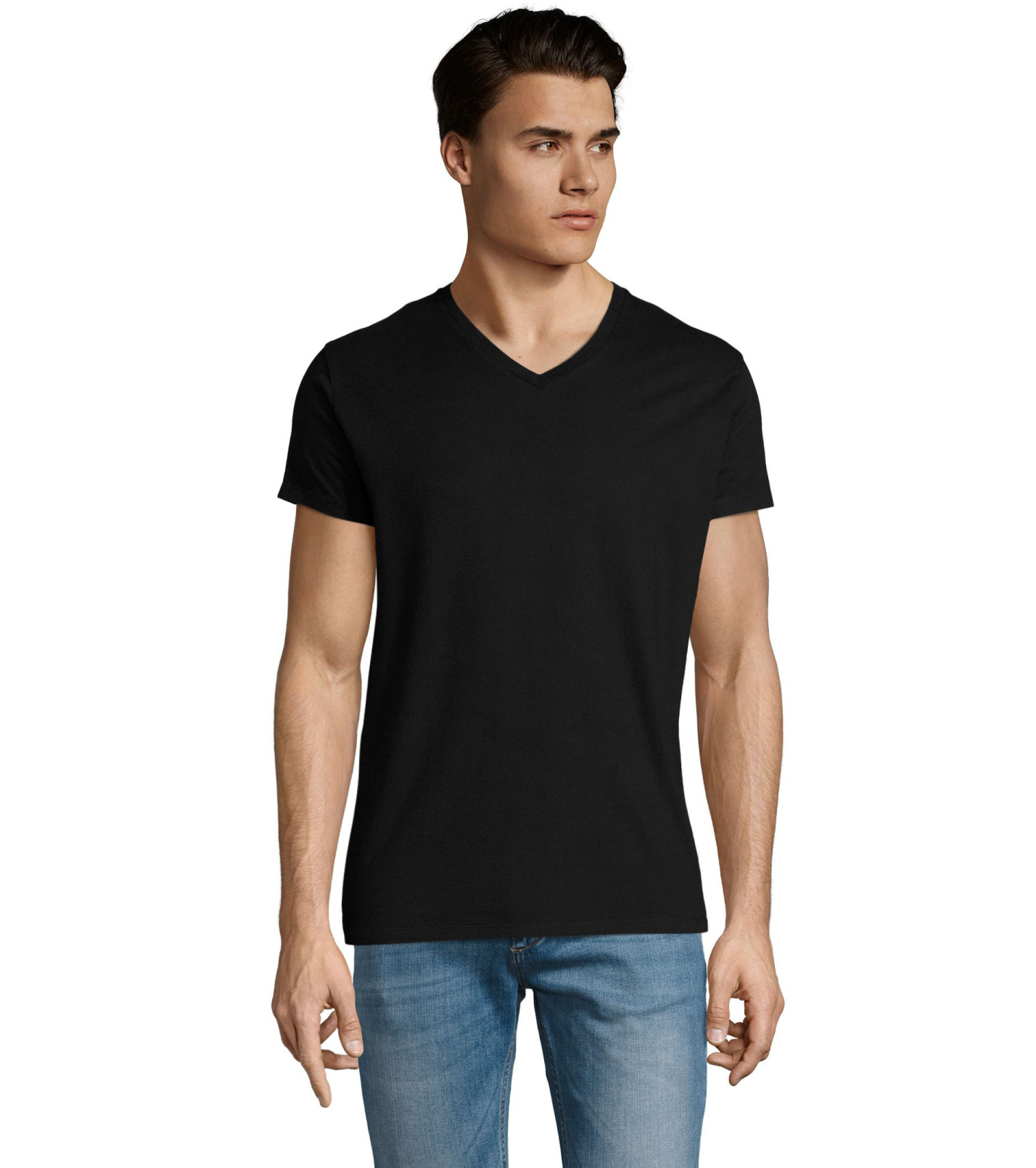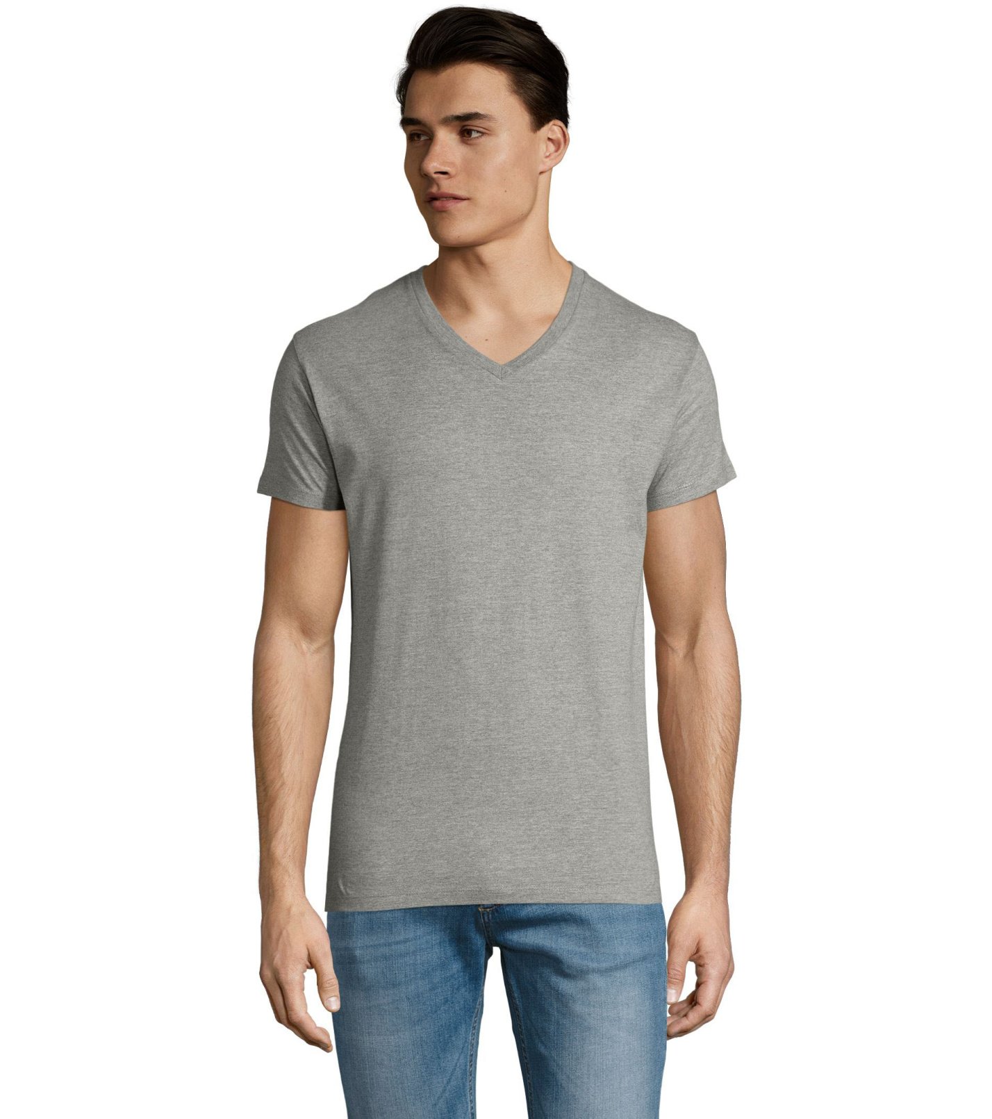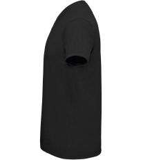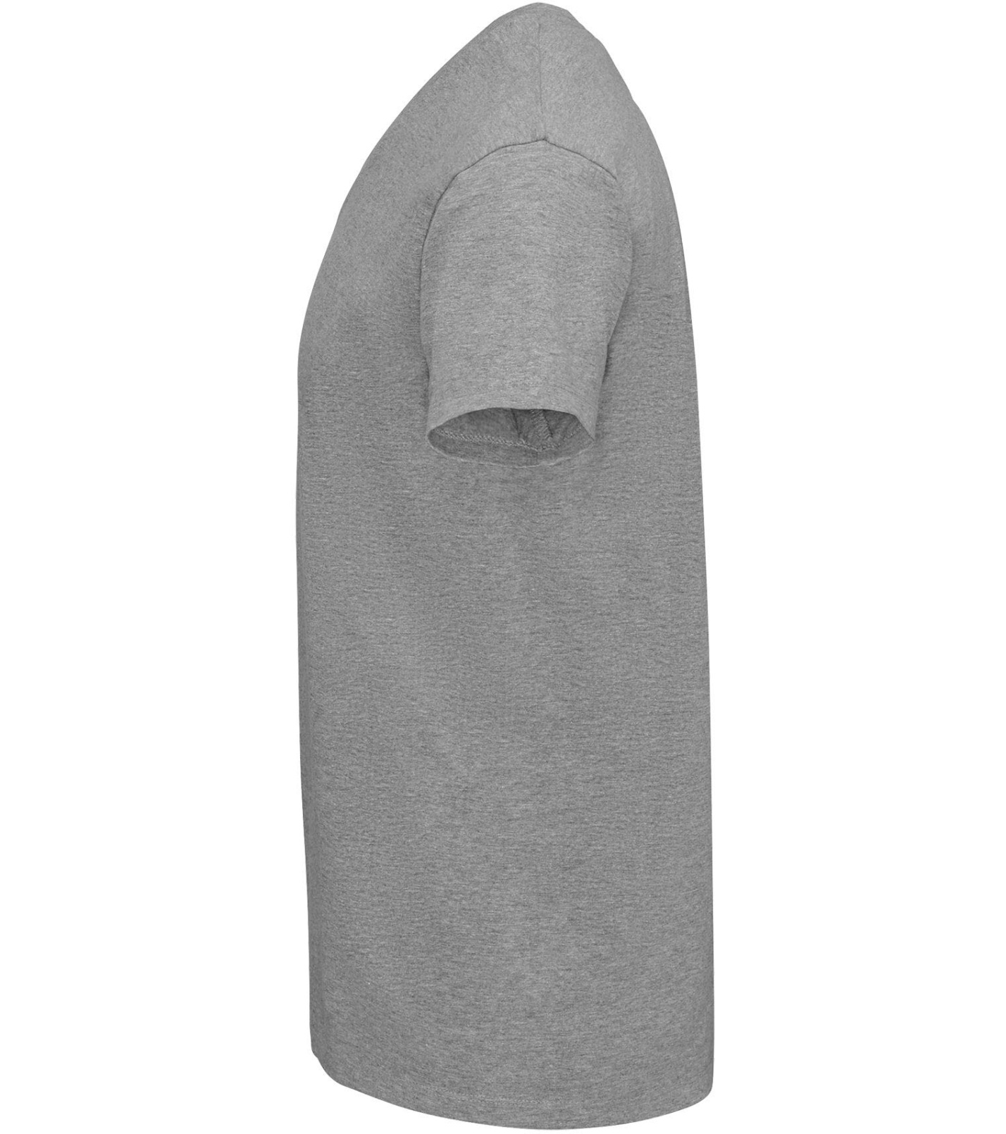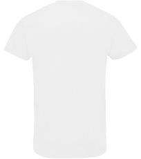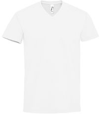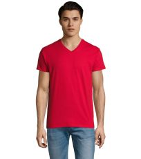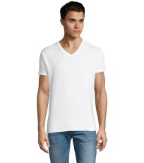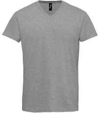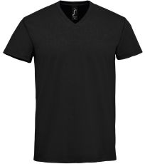 Pánské tričko tubulárního střihu s krátkým rukávem a výstřihem do V. Tričko má žebrový lem kolem krku podlepený.