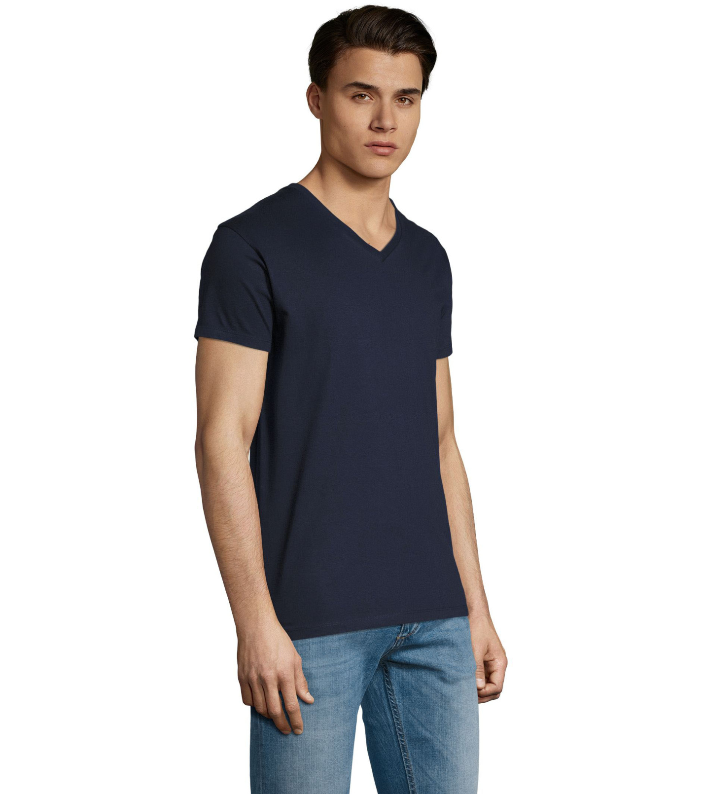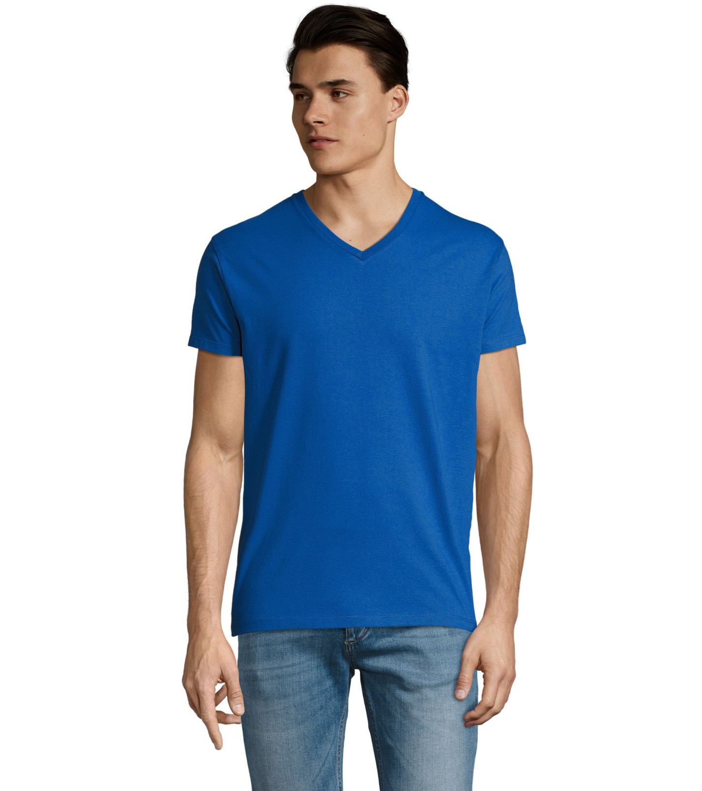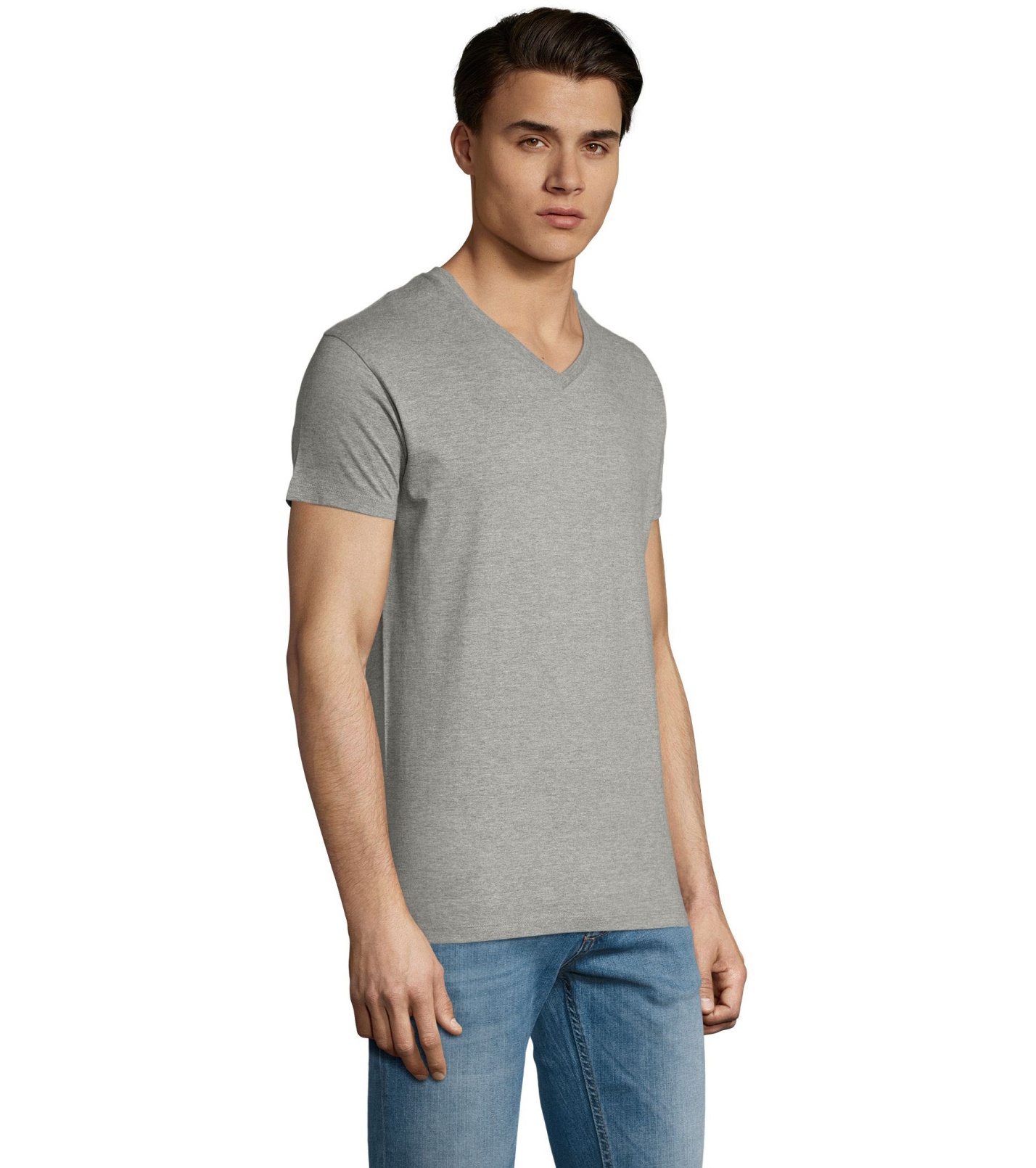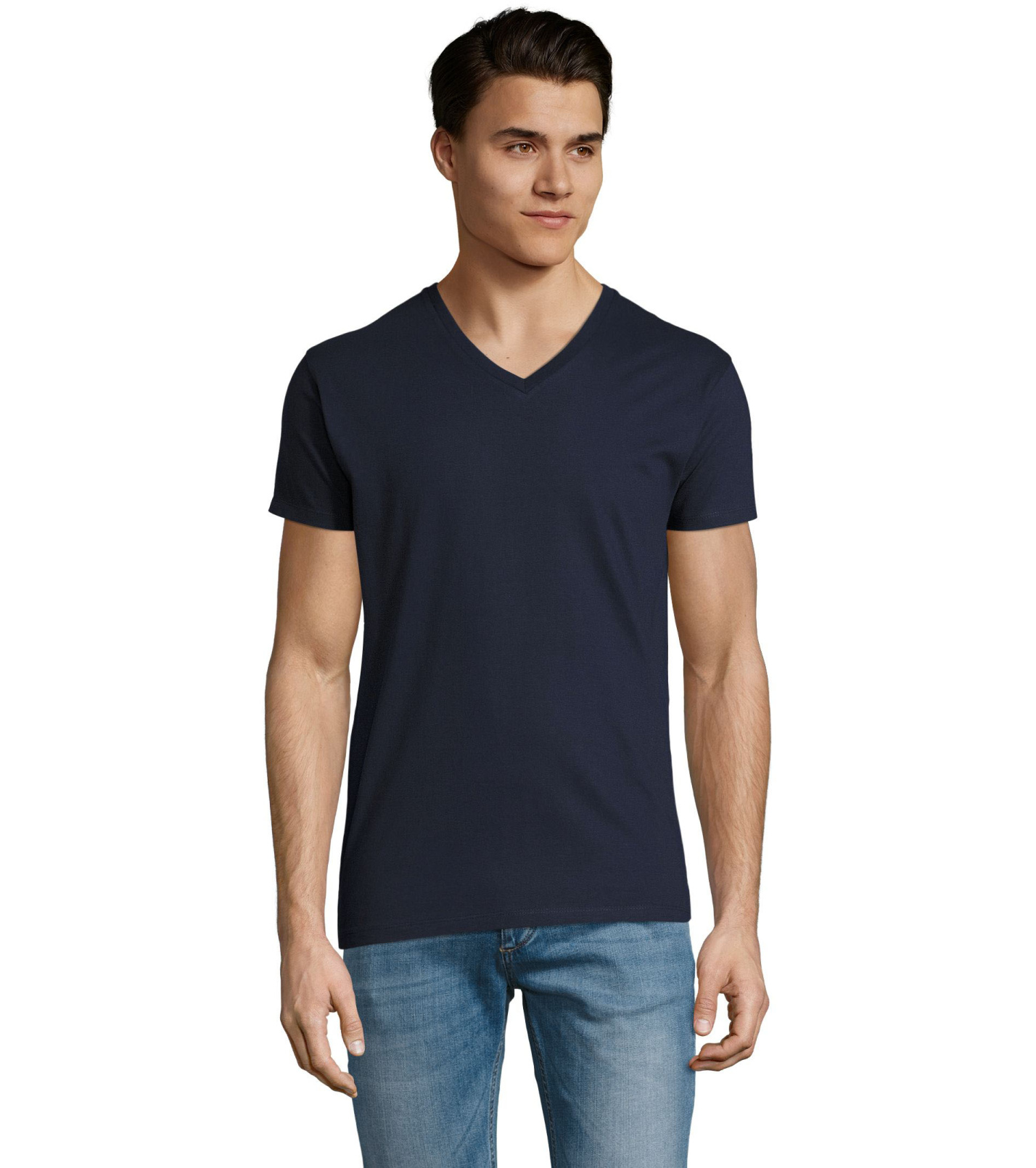 Pánské tričko tubulárního střihu s krátkým rukávem a výstřihem do V. Tričko má žebrový lem kolem krku podlepený.