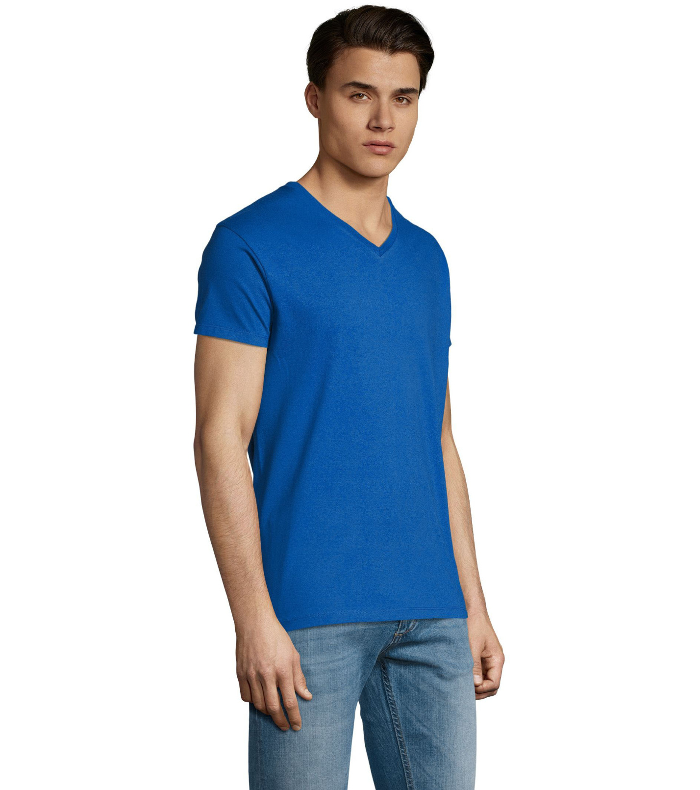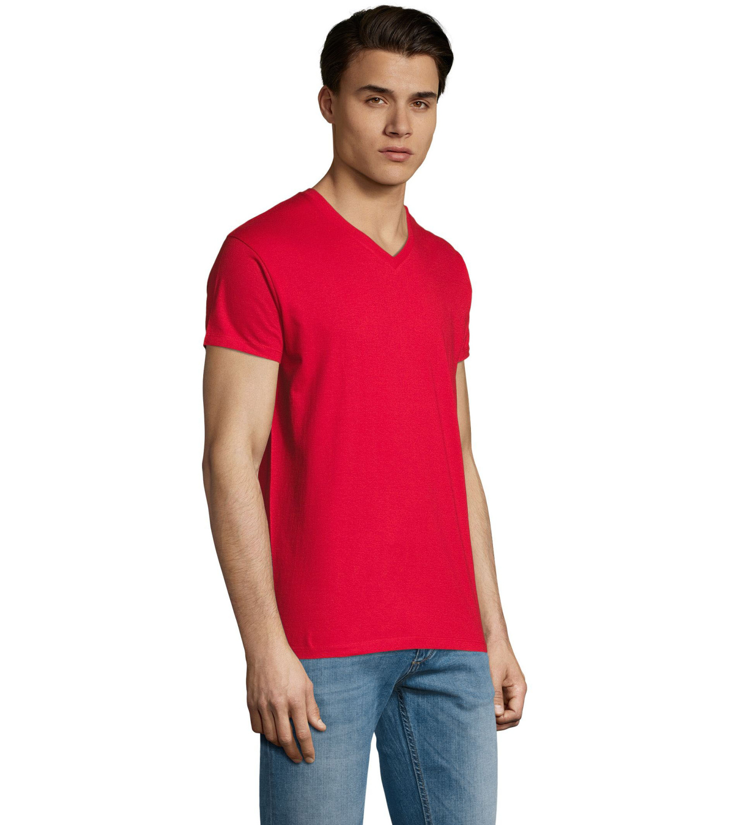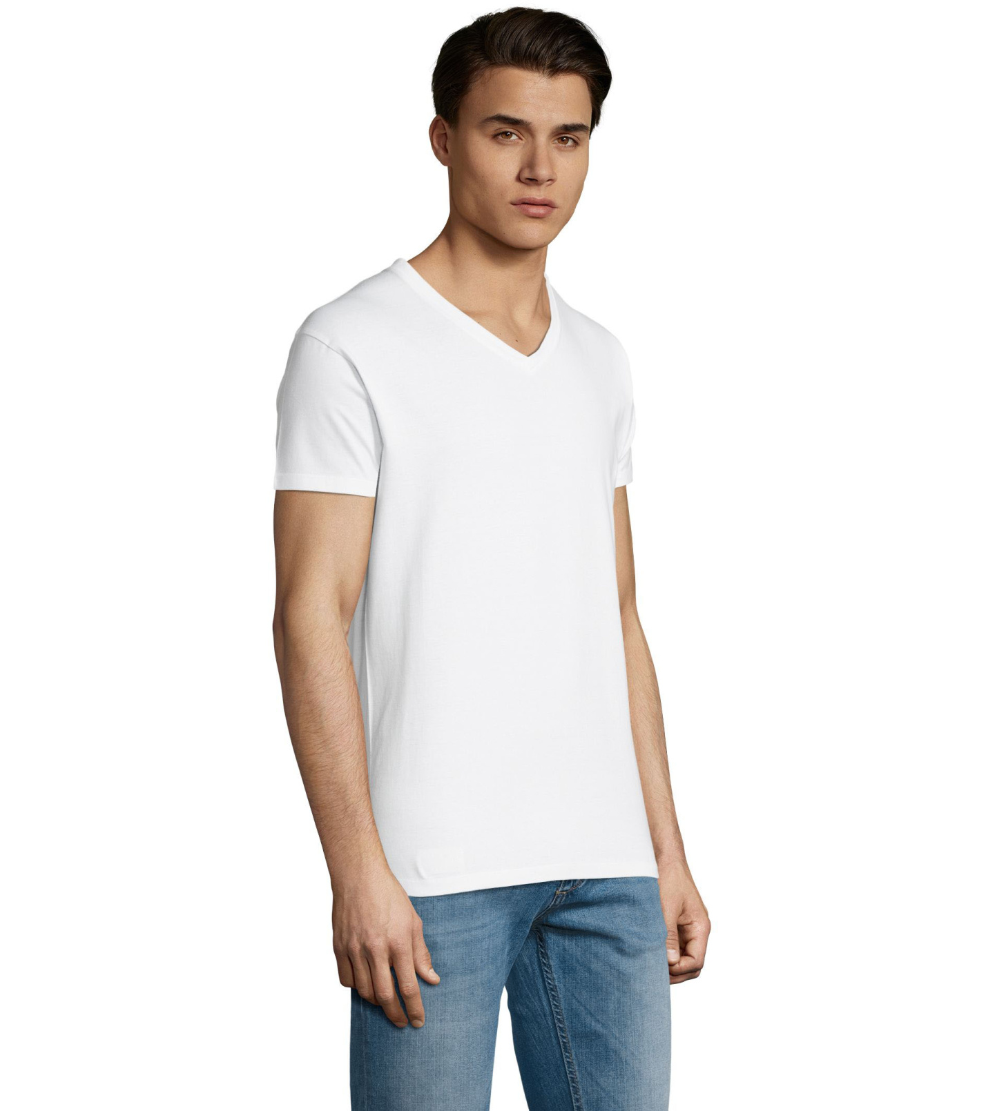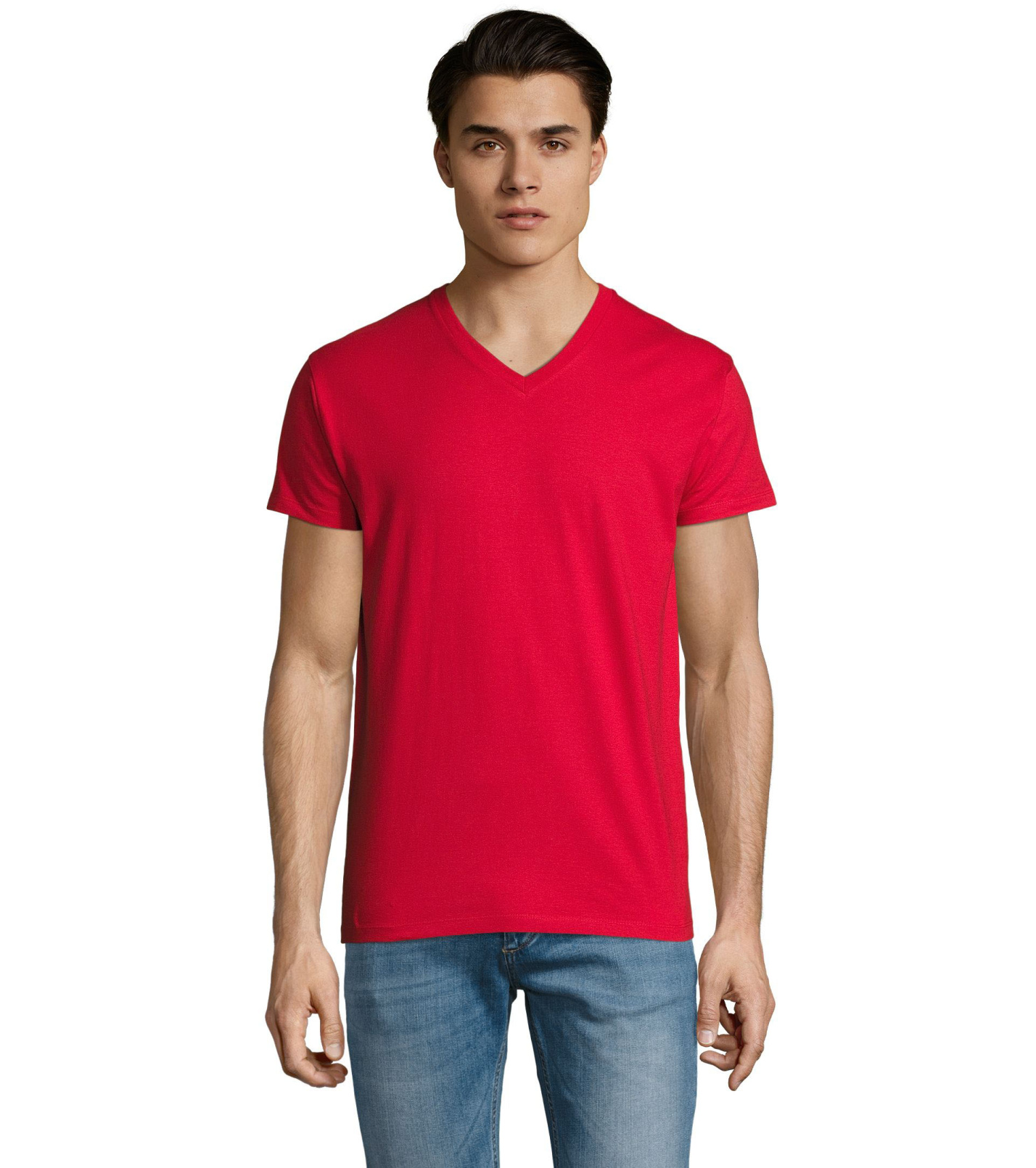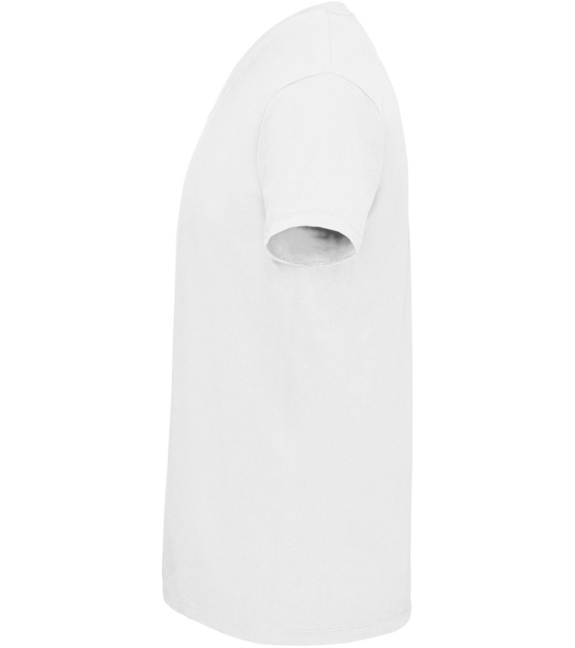 Pánské tričko tubulárního střihu s krátkým rukávem a výstřihem do V. Tričko má žebrový lem kolem krku podlepený.
