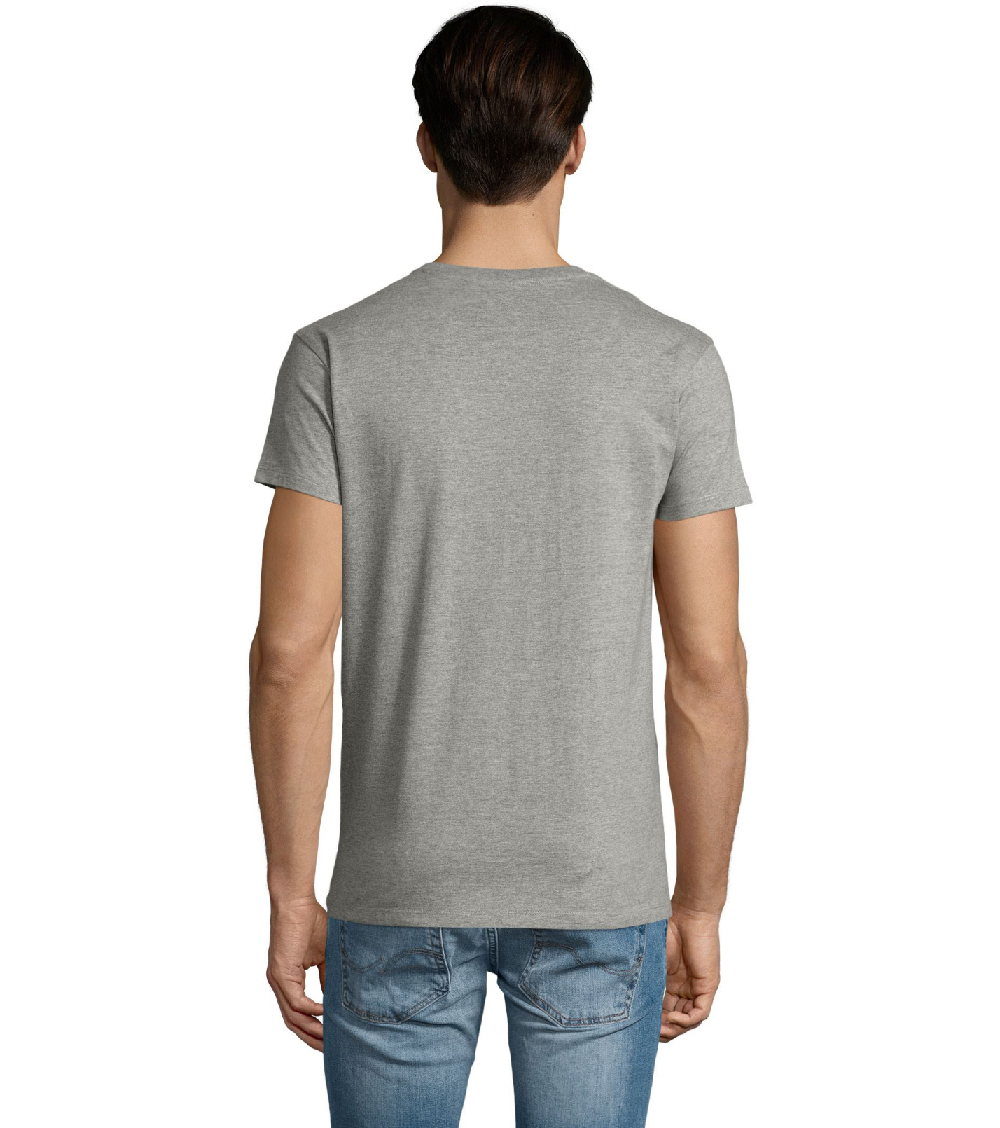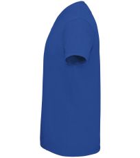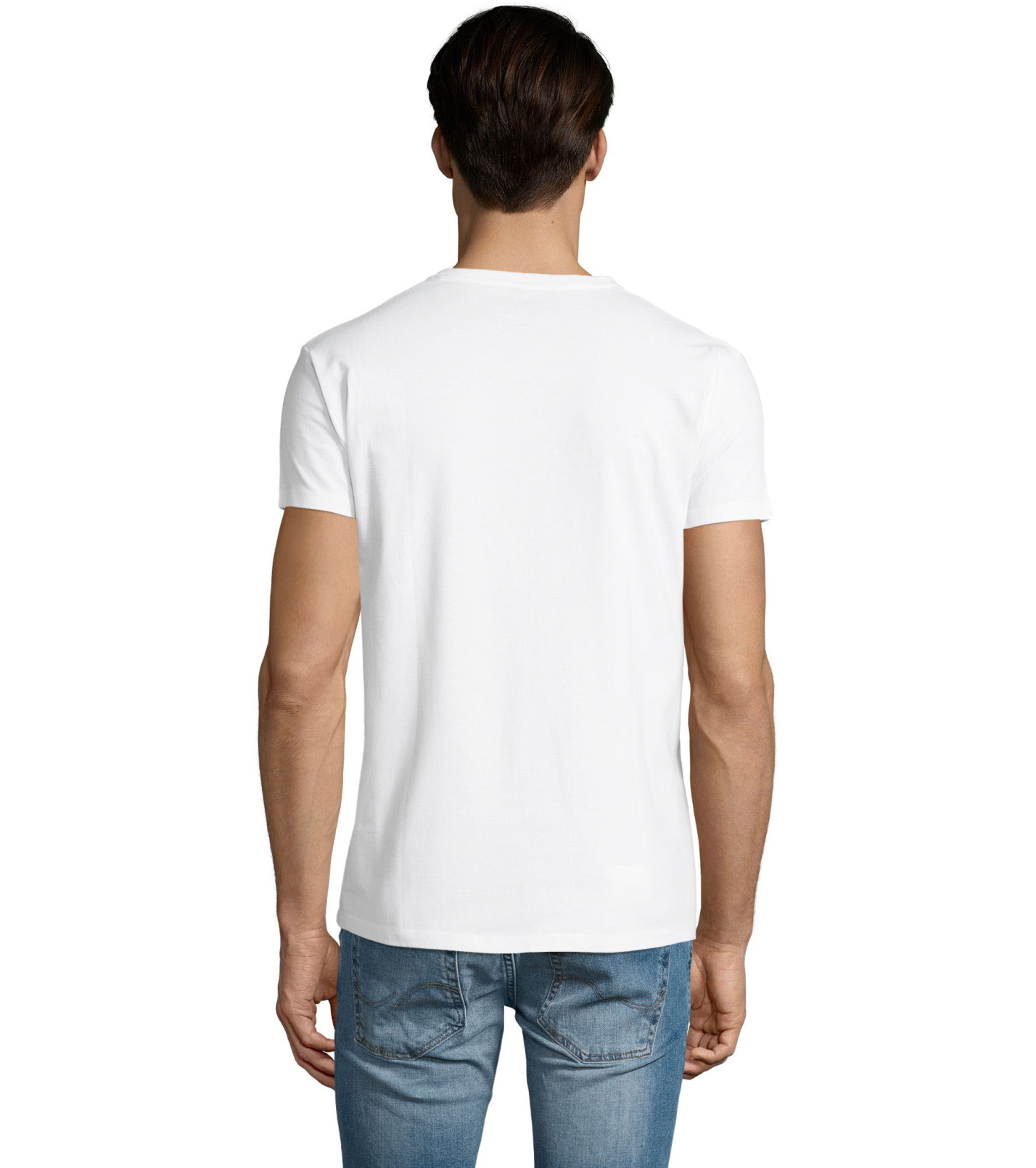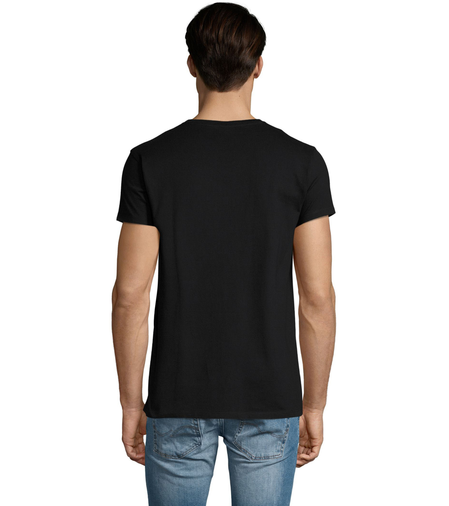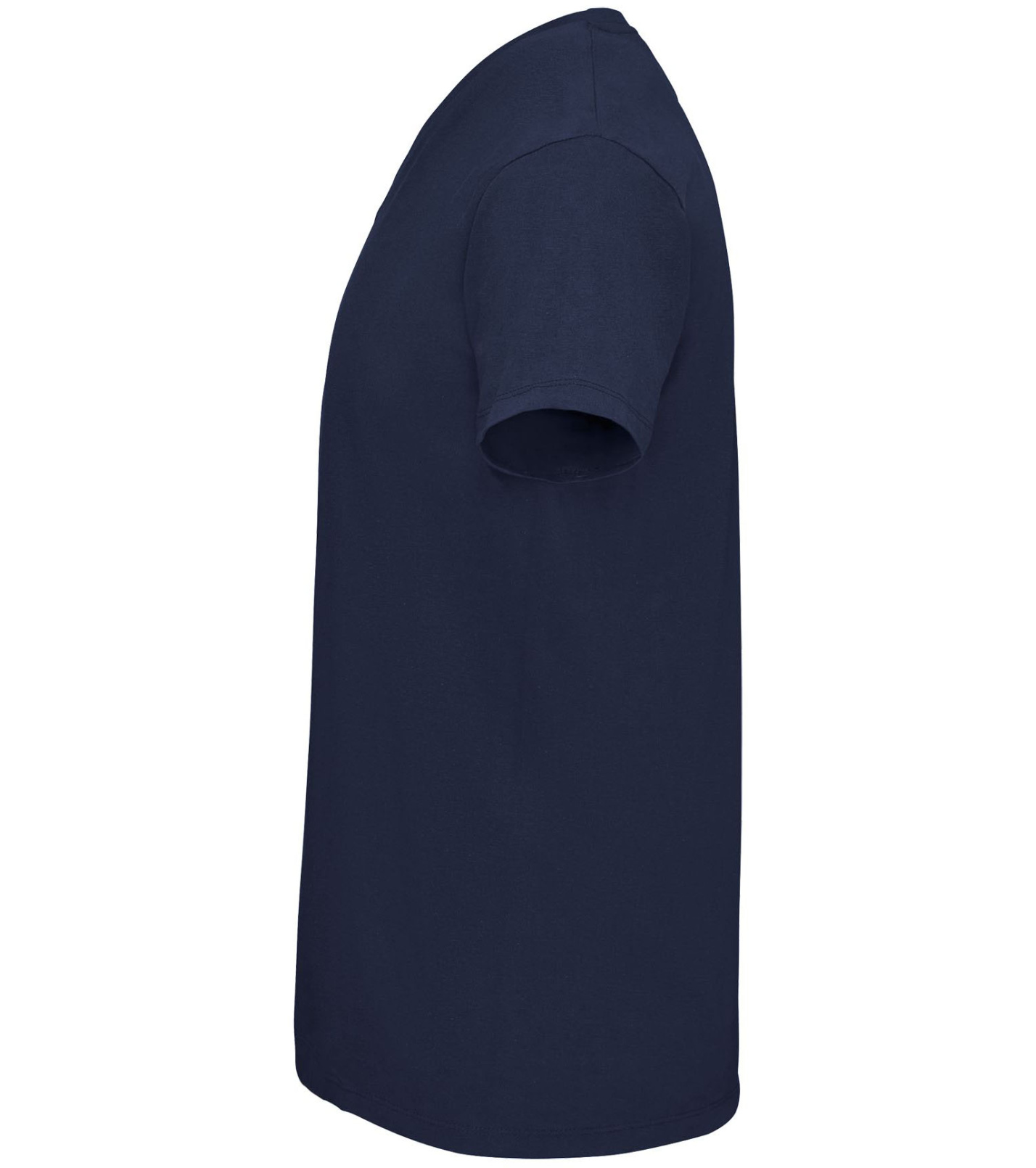 Pánské tričko tubulárního střihu s krátkým rukávem a výstřihem do V. Tričko má žebrový lem kolem krku podlepený.