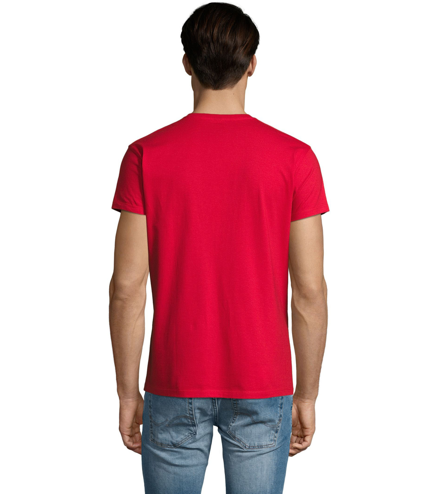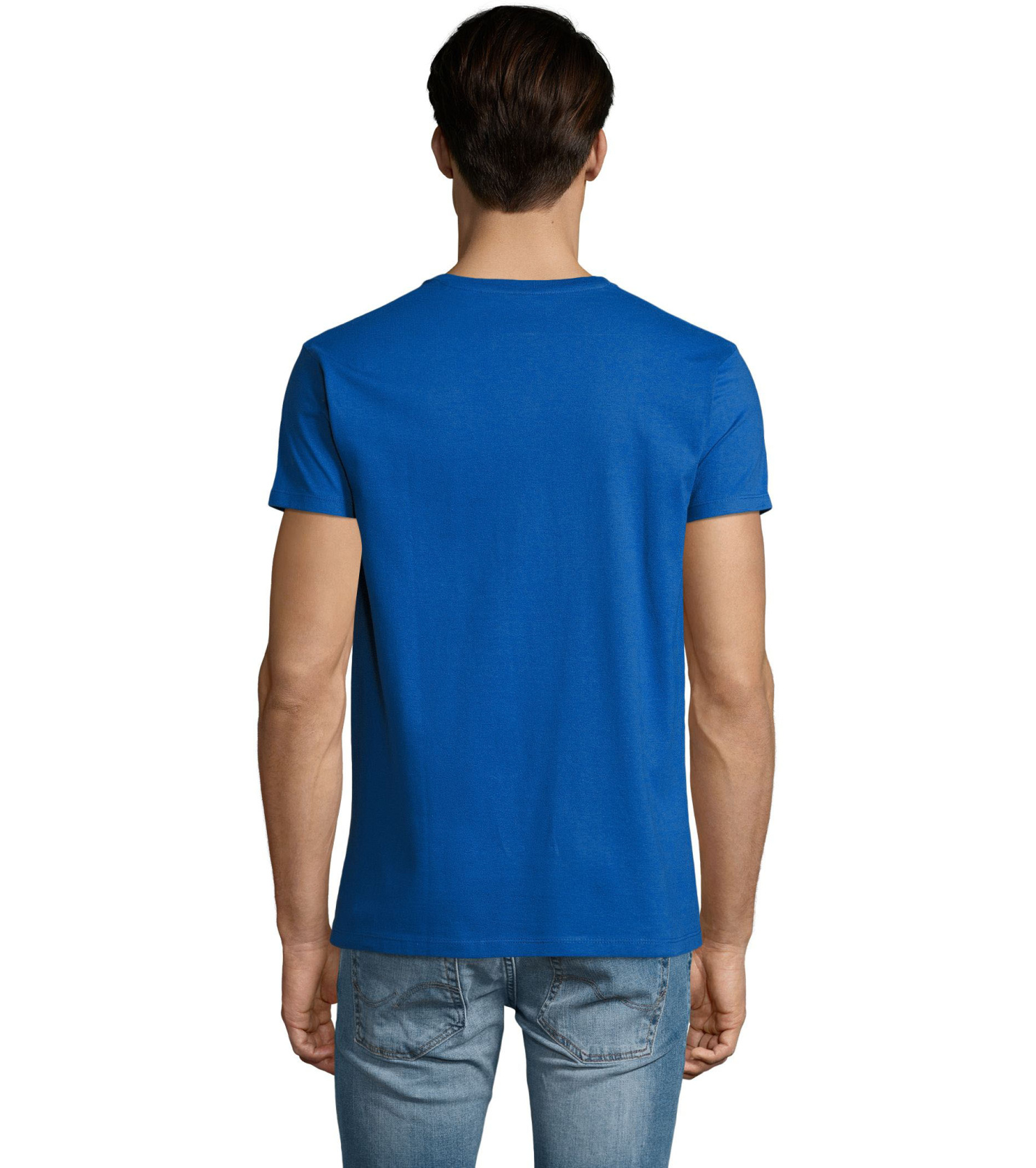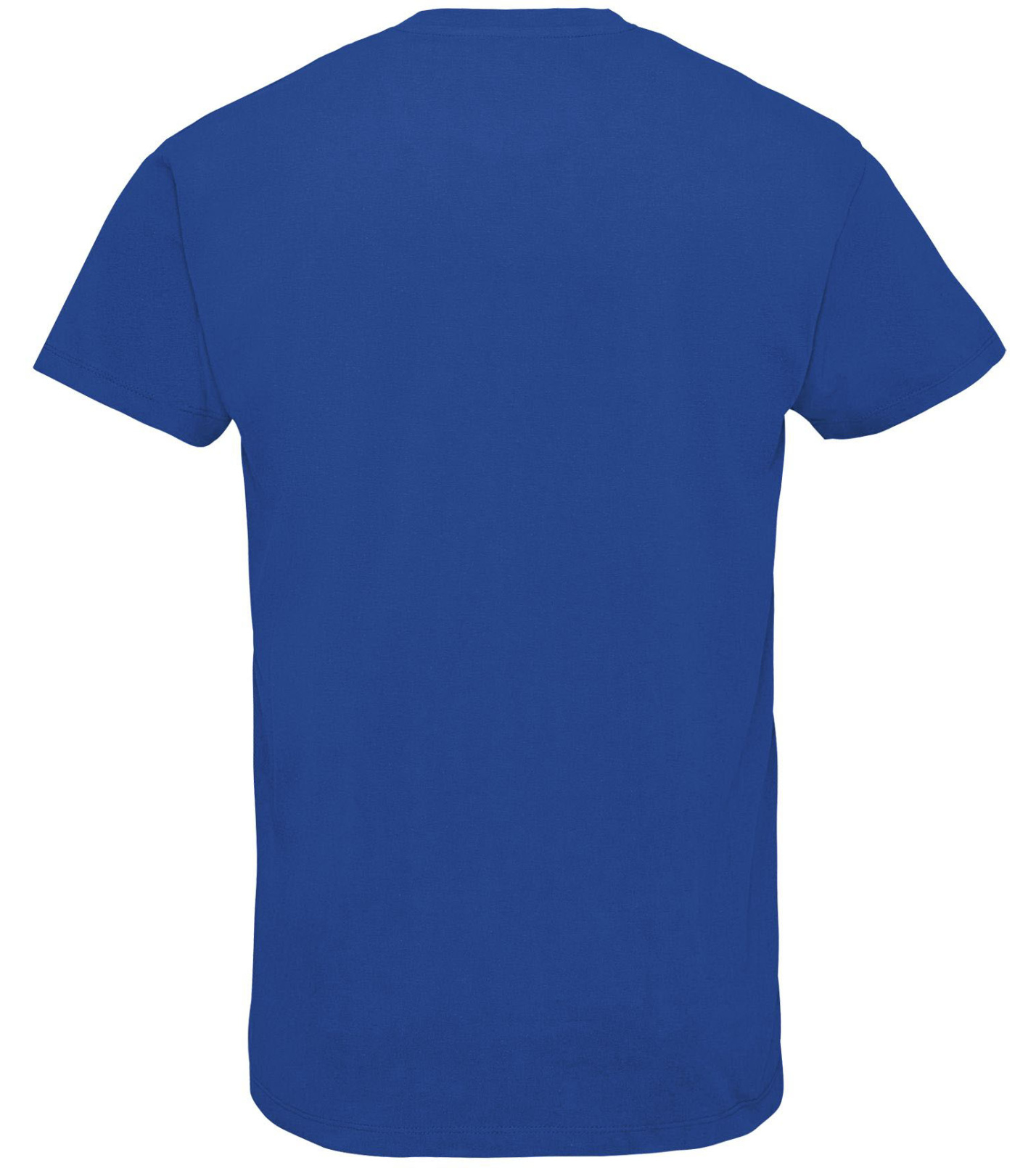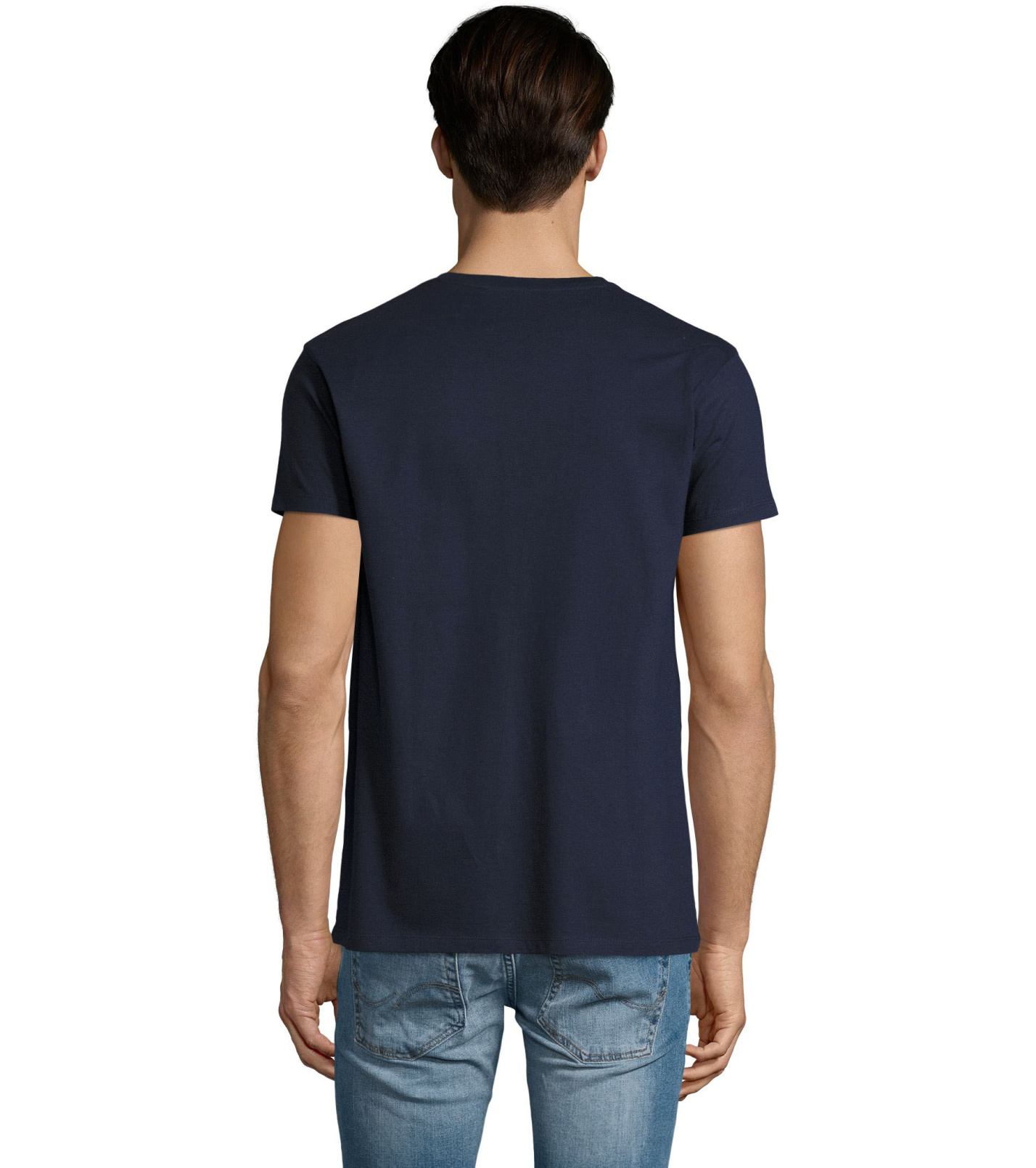 Pánské tričko tubulárního střihu s krátkým rukávem a výstřihem do V. Tričko má žebrový lem kolem krku podlepený.