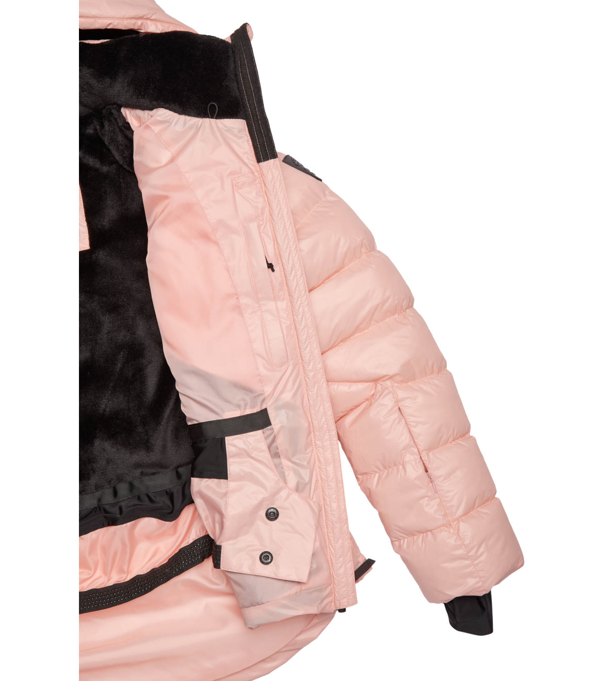 Všitá ochraná sněhová manžeta, která zabraňuje pronikání sněhu pod oděv. Ve spodní části je našita elastická protismyková guma.
