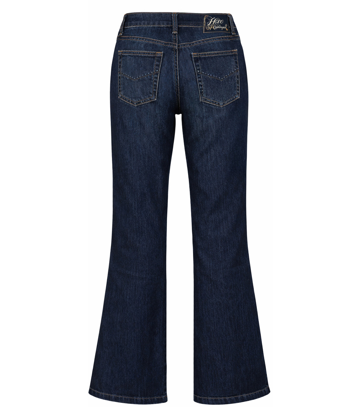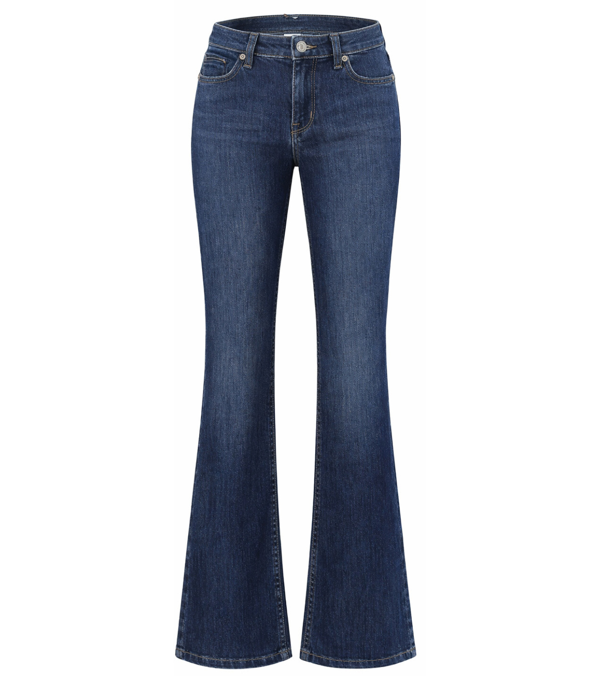 Tmavě modré džíny s lehce vyšisovaným efektem a výrazně rozšířenými nohavicemi do zvonu, které vytvářejí elegantní a ženskou siluetu. Přiléhavý střih v oblasti pasu, boků a stehen krásně tvaruje postavu, zatímco kvalitní denim zajišťuje pohodlí při nošení. Klasické zapínání na knoflík a zip, pět kapes a jemné kontrastní prošití podtrhují nadčasový vzhled. Stylový kousek vhodný pro každodenní i výraznější outfity.