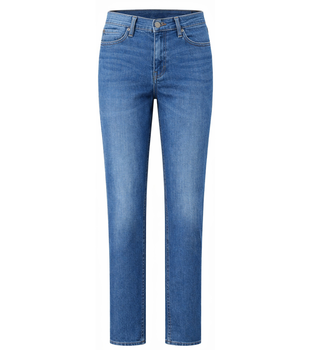 Dámské klasické džínové kalhoty se zipem a značkovým knoflíkem. Rovné nohy. Nýtované přední kapsy. Na zadní straně řemínku je kůže s vyraženým logem výrobce. Modrá barva se světlejšími oděrky.