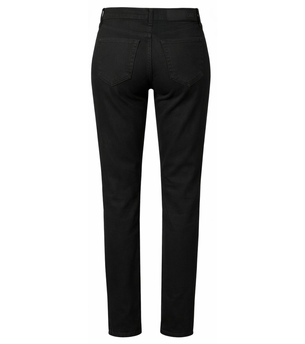 Dámské strečové džíny ve střihu MARION STRAIGHT s vysokým pasem a rovnou širší nohavicí až pod kotník. Kalhoty jsou vyrobeny z černého denimu bez dalších úprav a jsou prošity světle oranžovou nití. Knoflík společně s nýty jsou v barvě mosazi. Denim s lehkou příměsí elestanu zajišťuje vysokou dávku pohodlí při každodenním nošení do práce, či pro volný čas. Džíny jsou vhodné k elegantní košili, ale i tričku.