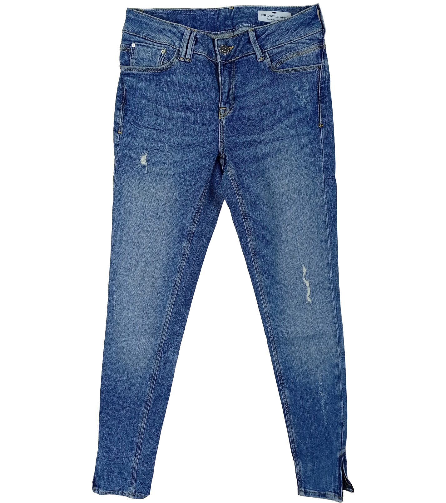 Dámské džíny Cross Jeans v moderním světle modrém denimu s lehkým „used“ efektem a decentními oděrkami. Střih s úzkými nohavicemi a středně vysokým pasem krásně zvýrazní postavu, spodní část nohavic je oživena malým rozparkem. Klasické zapínání na zip a knoflík doplňuje pět praktických kapes. Díky pružnému materiálu jsou džíny pohodlné na nošení a skvěle se hodí k ležérním i trendy outfitům.