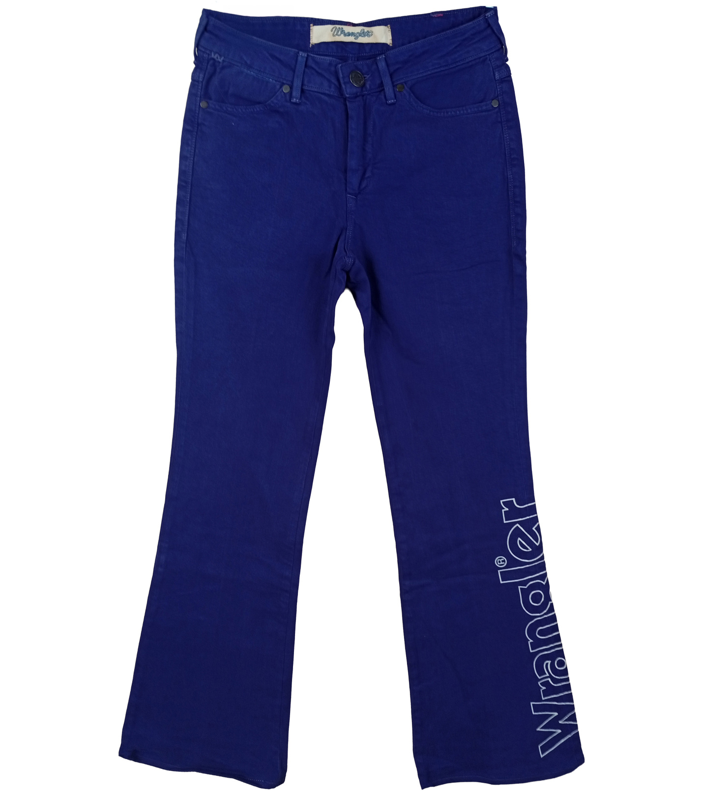 Vystupte z davu s těmito výraznými dámskými džíny Wrangler Joni v zářivě královsky modré barvě. Flare střih dodává retro nádech, zatímco moderní detaily z nich dělají jedinečný kousek. Na pravé nohavici je umístěno velké kontrastní logo Wrangler, které podtrhuje ikonický styl značky.