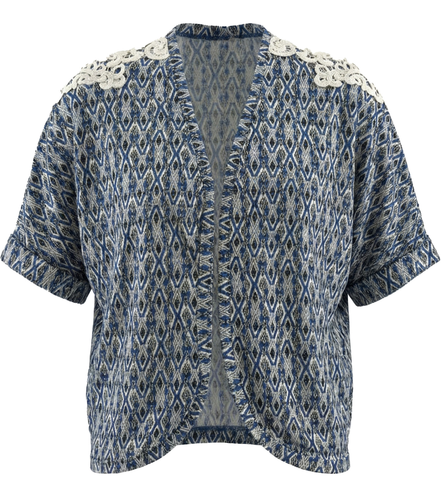 Dámský přehoz s krátkým rukávem. Svetr je na ramenou zdoben decentní krajkou. Rukávy mají zúženou manžetu.