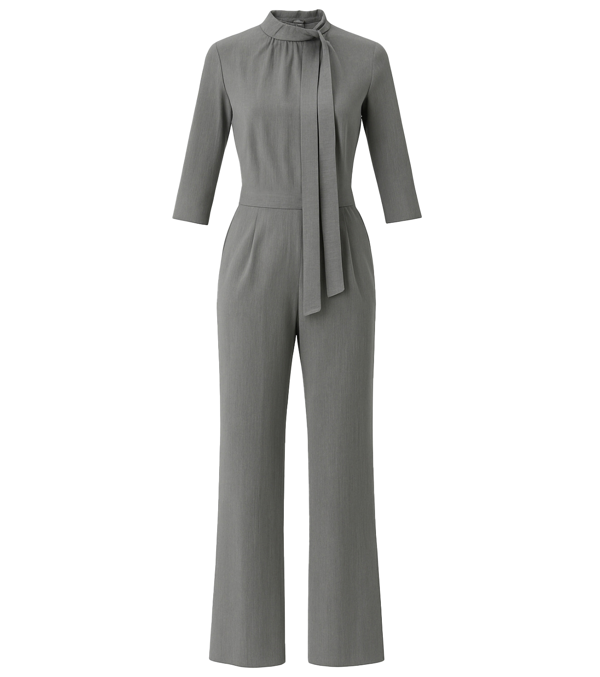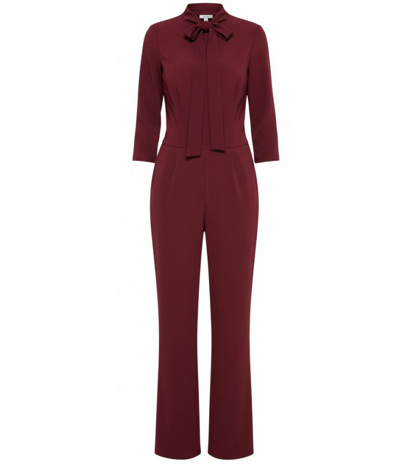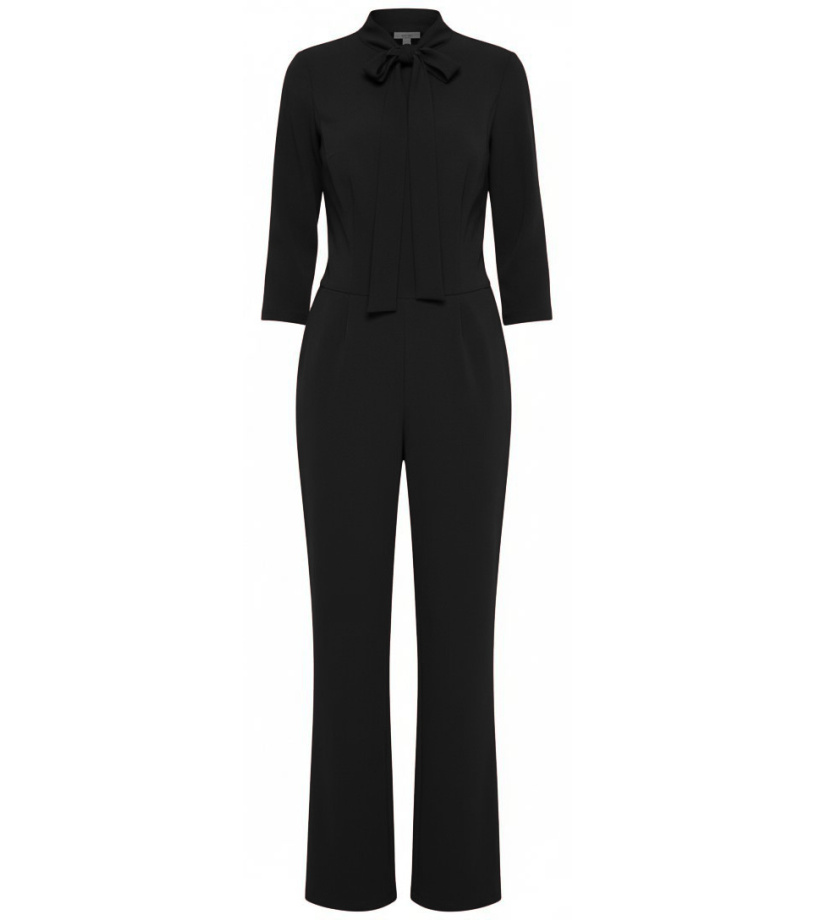 Dámský společenský overal s 3/4 rukávem. Na zadním díle overalu je zapínání na zip. Dvě kapsy. Overal má decentní límeček, který přechází do šňůrek, ze kterých se dá uvázat ozdobná mašle pod krkem.