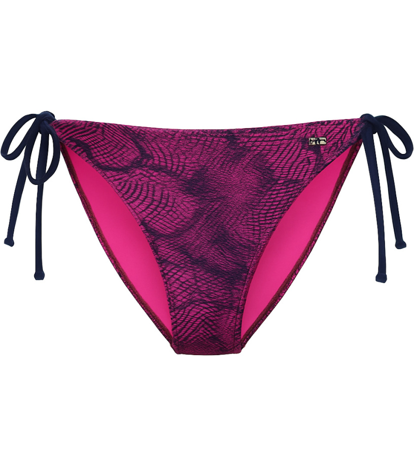 Dámské plavkové kalhotky 4F v moderním růžovo-fialovém designu s jemným vzorem a kontrastními tmavě modrými šňůrkami na bocích umožňují nastavení obvodu pro perfektní přizpůsobení postavě. Jsou vyrobené z rychleschnoucího, elastického materiálu, který zajišťuje pohodlí a volnost pohybu při plavání i opalování. Stylový kousek pro letní dny u vody.