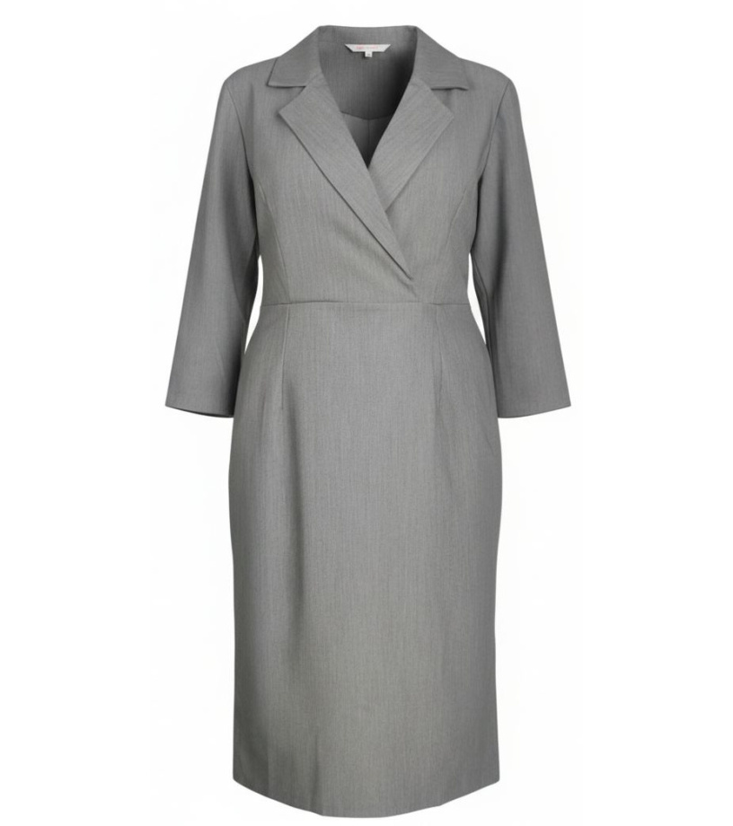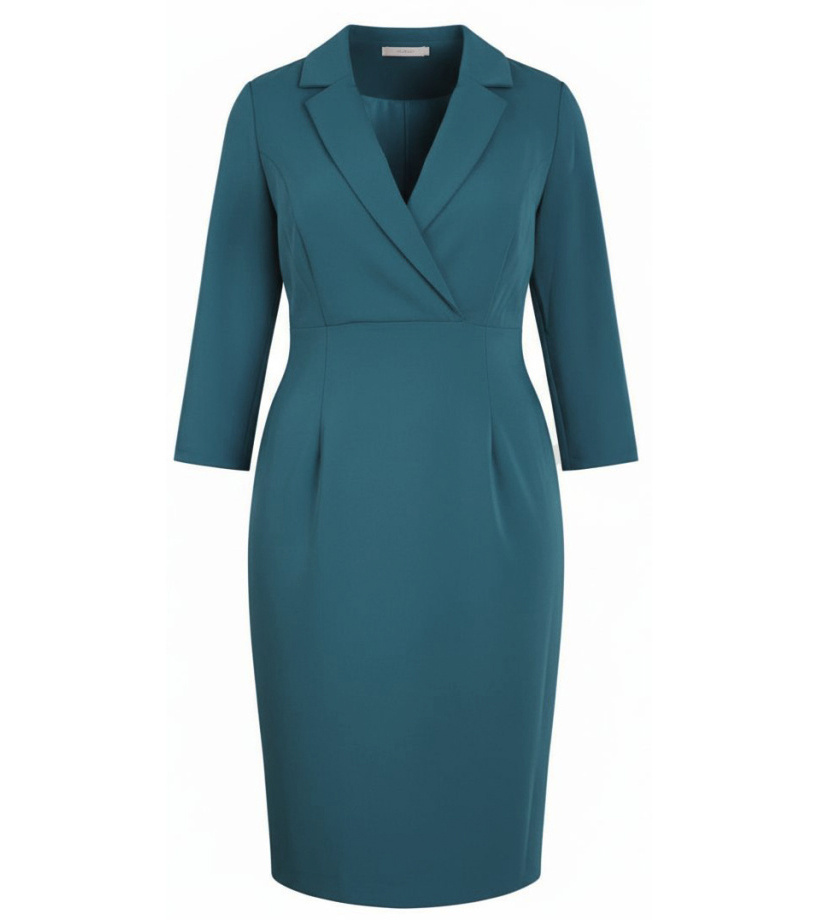 Dámské pouzdrové šaty s 3/4 rukávem. Délka po kolena. Šaty mají límeček, výstřih je do V. Záševky na předním díle, zapínání šatů je umístěno v levém podpaží.