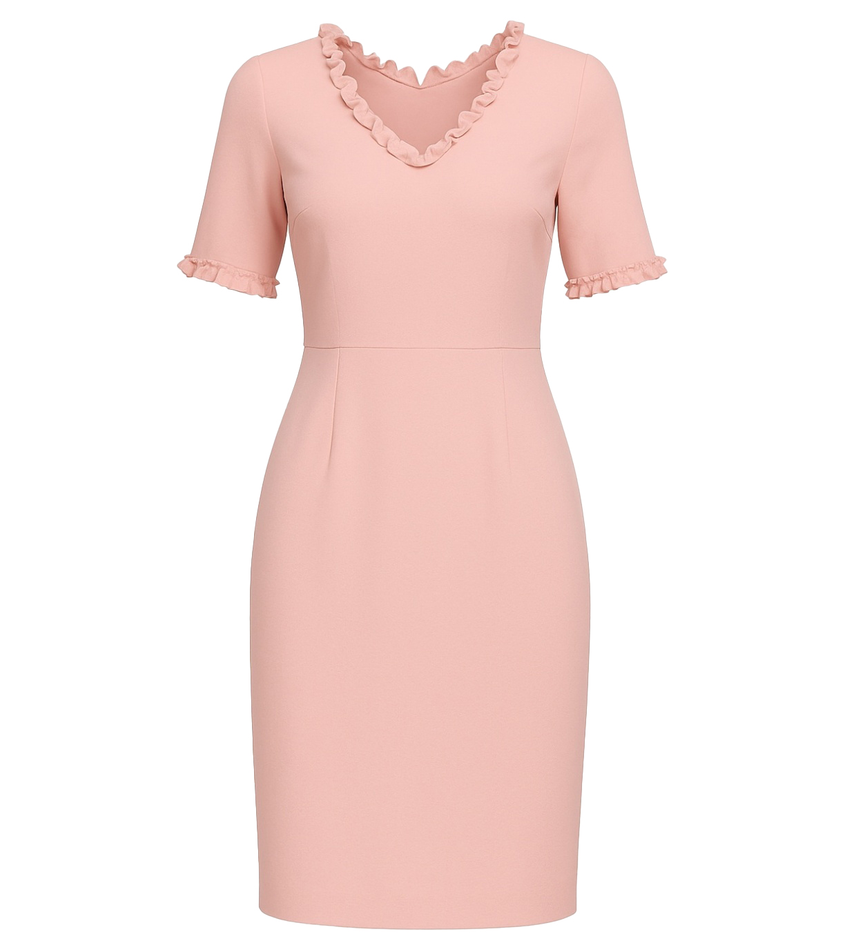 Dámské šaty s krátkým rukávem. Konec rukávu je zakončený ozdobným lemem. Záševky na předním díle. Šaty jsou pouzdrového střihu. Výstřih do V je zdobený lemem. Délka šatů je po kolena, zapínání na zádech na zip.