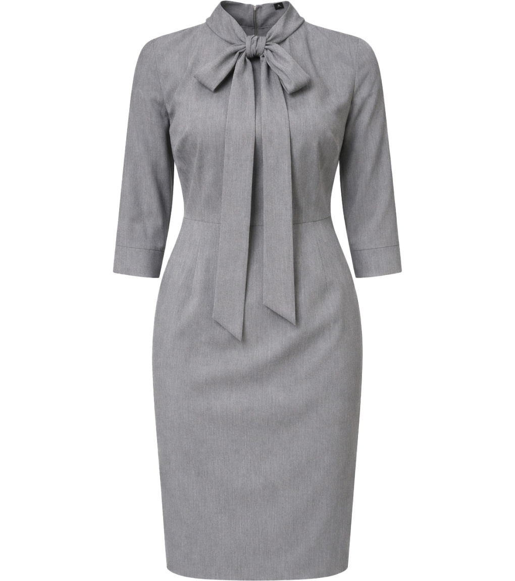 Dámské šaty s 3/4 rukávem. Spodní lem rukávu je široký a má rozparek. Šaty mají límeček, který přechází do dvou tkaniček, ze kterých lze uvázat mašli. Na zádech zapínání na zip. Rozparek na zadním díle, šaty nemají podšívku.