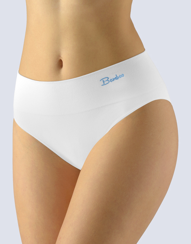 Kalhotky klasického střihu se širokým bokem a širokou pasovou záložkou, dámské bezešvé prádlo. Pasový kraj je zesílený a zapravený bezešvým způsobem. V nohavičkách je zašitá úzká pruženka. Kalhotky jsou jednobarevné. V záložce je vypletené barevné logo.