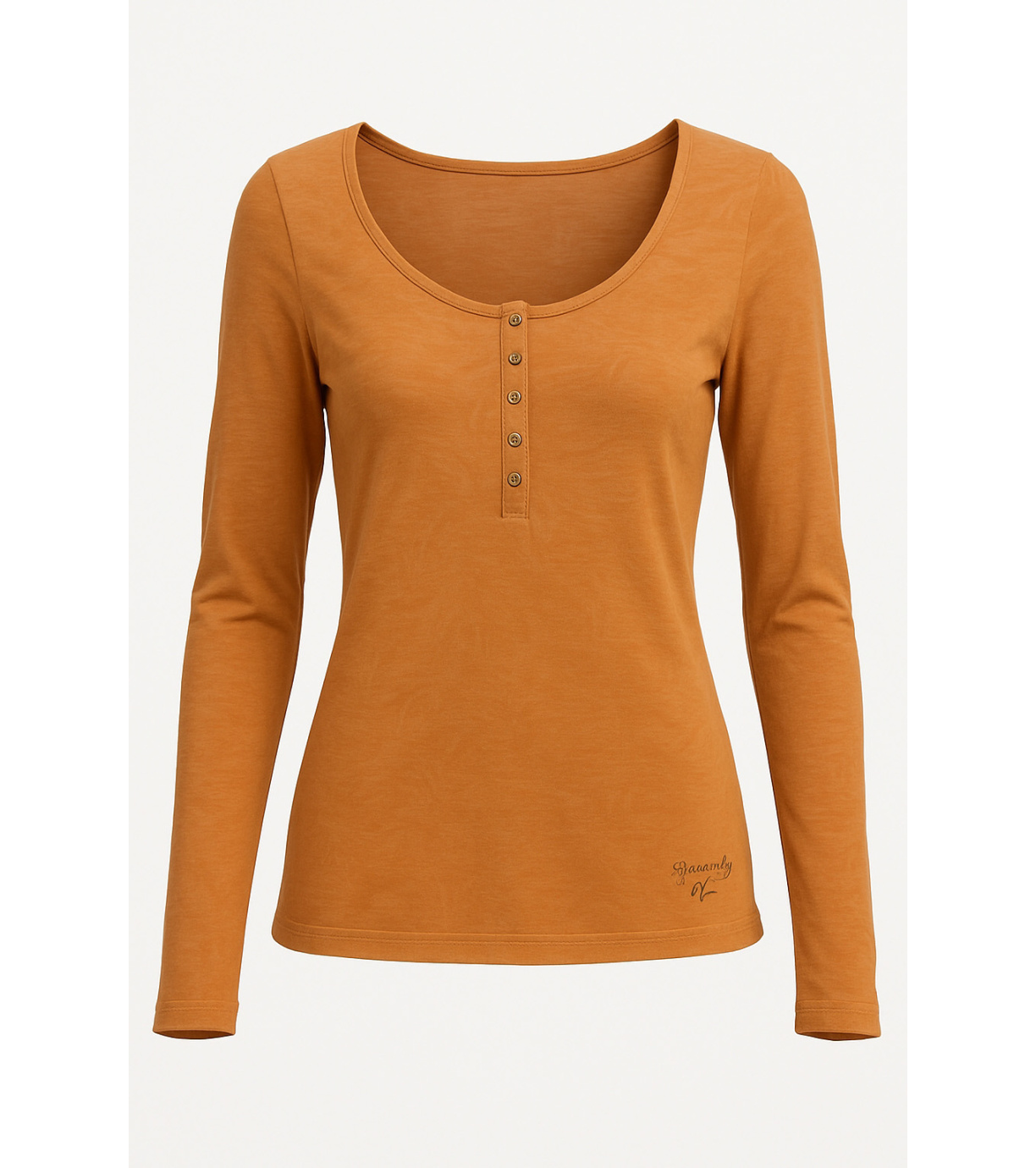 Dámské tričko s dlouhým rukávem z tenkého a lehkého materiálu, ideální pro každodenní nošení. Kombinace polyesteru a viskózy zajišťuje příjemnou hebkost, prodyšnost a pohodlí. Tričko má elegantní výstřih s knoflíčky a decentní potisk u lemu. Skvěle se hodí jak k džínům, tak i k sukni pro ležérní i stylový outfit.