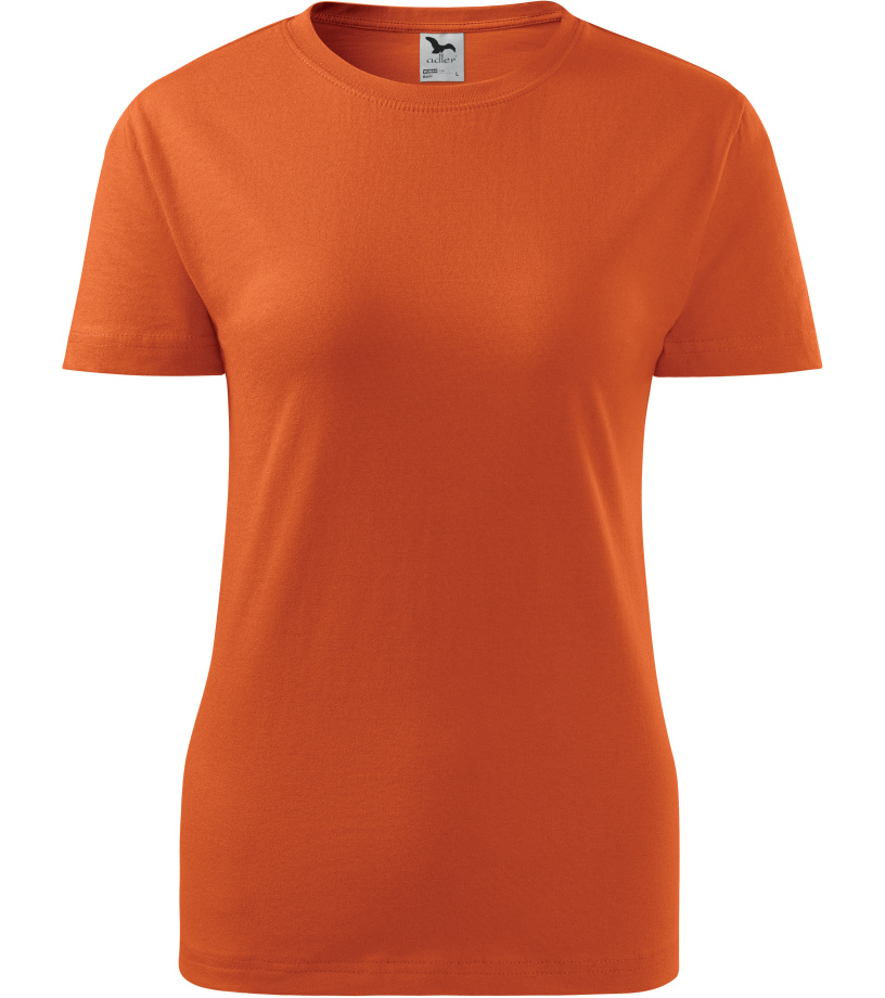 Kvalitní dámské tričko lehce projmutého střihu s bočními švy vhodné pro potisk a výšivky má úzký lem průkrčníku z žebrového úpletu 1:1 s 5 % elastanu, vnitřní část průkrčníku začištěna páskou z vrchového materiálu, zpevnění ramenních švů páskou a silikonovou úpravu.