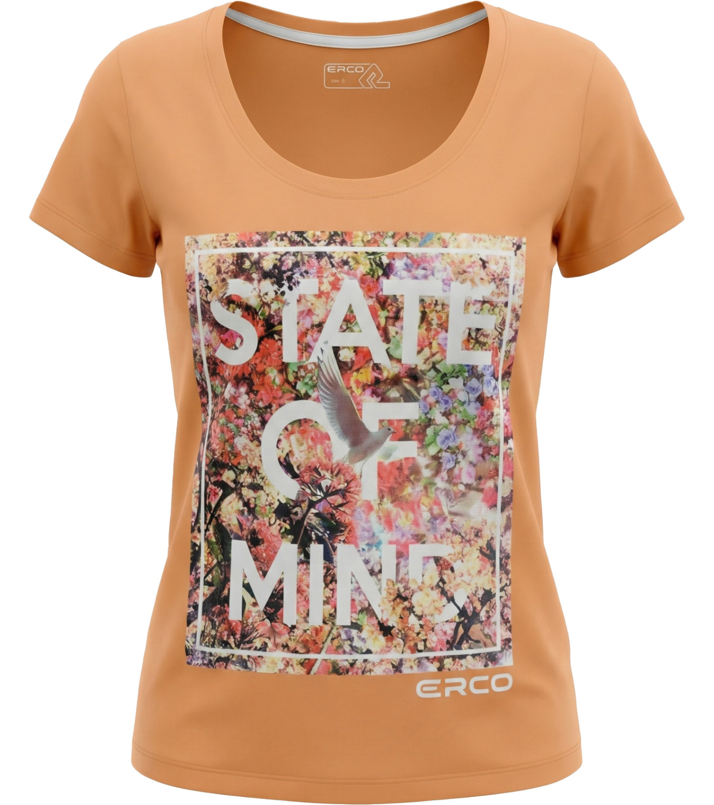 Stylové dámské tričko v teplém oranžovém odstínu s výrazným potiskem na přední straně. Originální grafika s květinovým motivem a nápisem „STATE OF MIND“ dodává tričku moderní a pozitivní vzhled. Kulatý výstřih a krátké rukávy zajišťují pohodlné nošení po celý den.